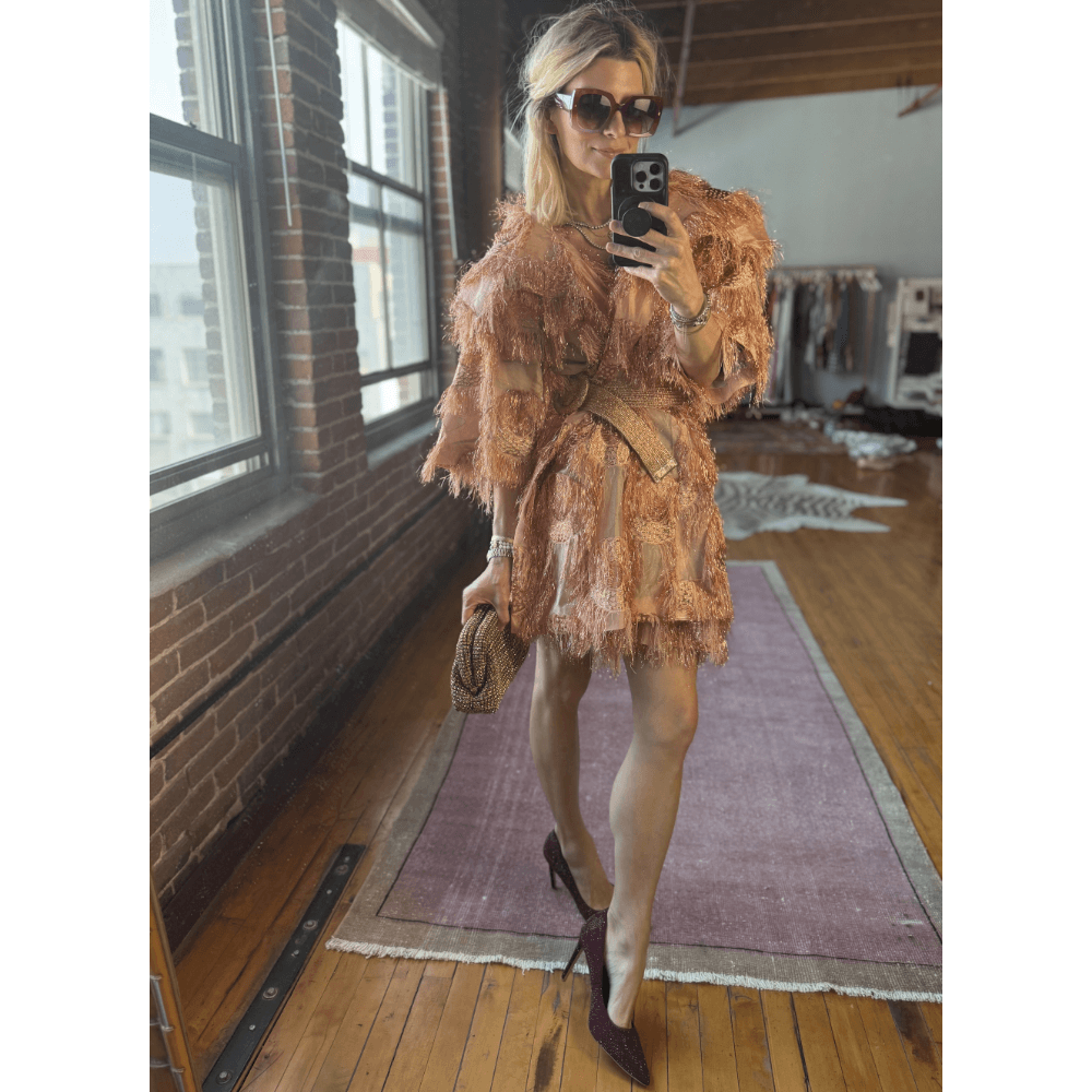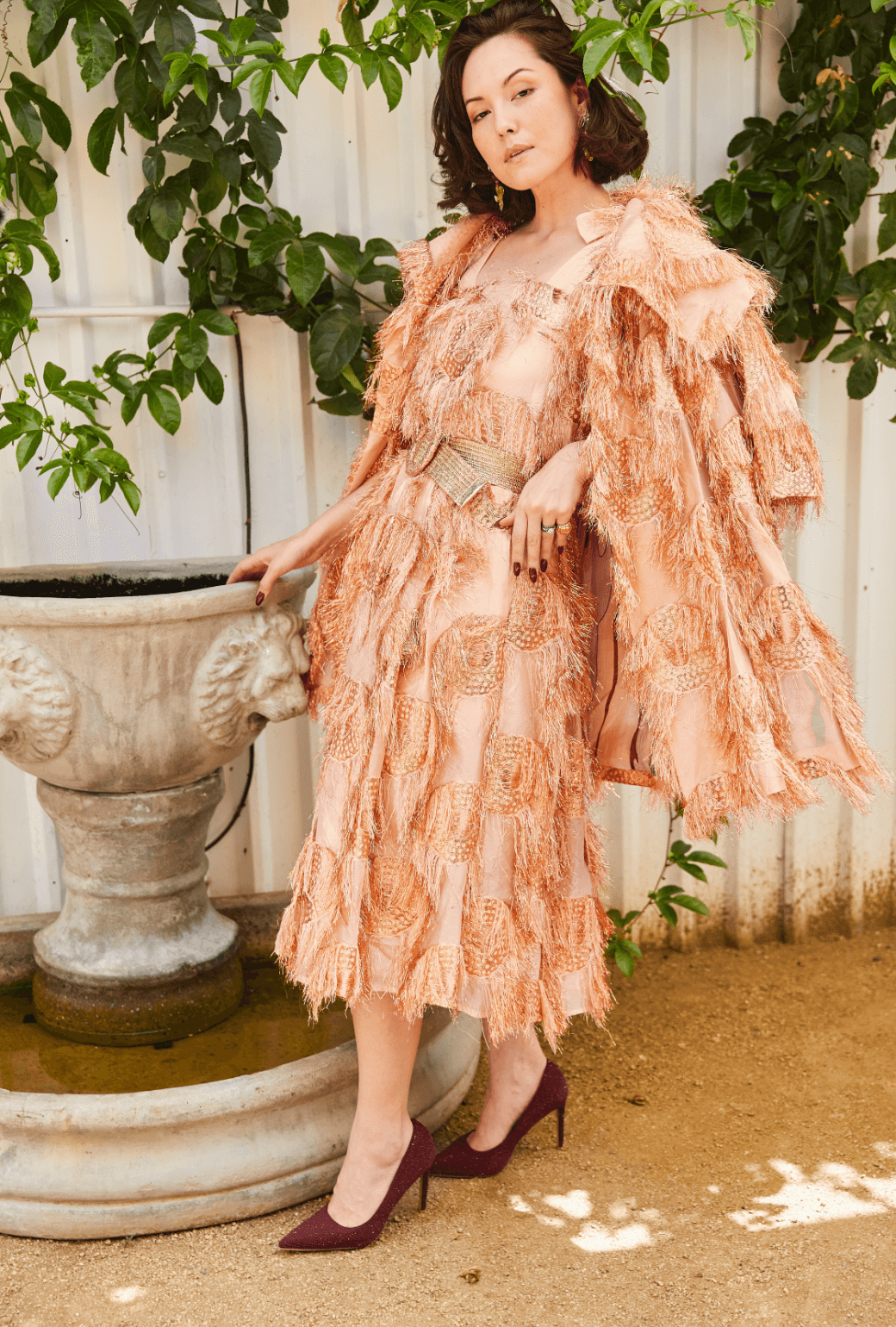 Looking for a flirtier way to wear our Car Coat Silhouette? Add a belt and treat it as a mini dress! Our Rose Gold stretch belt is the perfect match to the fun eyelash fabric.