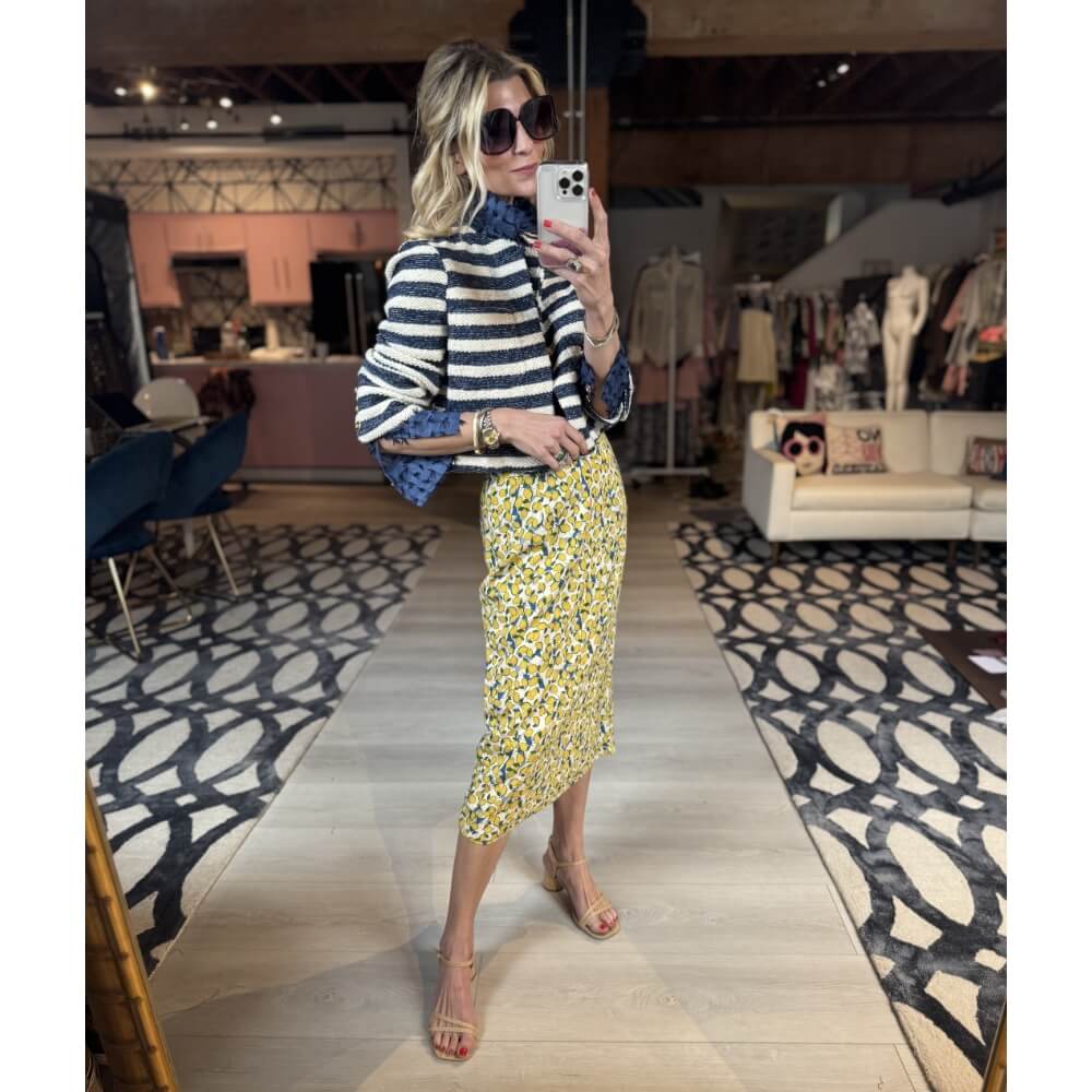 Limoncello? Yes, please! We love our cardigan blazer styled with our limoncello pencil skirt and our whimsical navy bow Mel. Our everyday raffia sandals add the finishing touch.