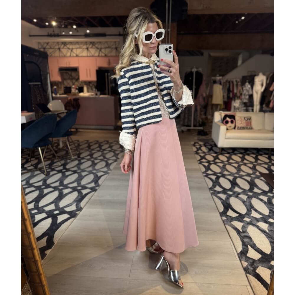 Layered over our Green Stripe Perry Blouse and coordinating Leland Skirt, this piece adds the perfect touch of warmth and ties in beautifully with the navy piping. Resort chic at its finest!