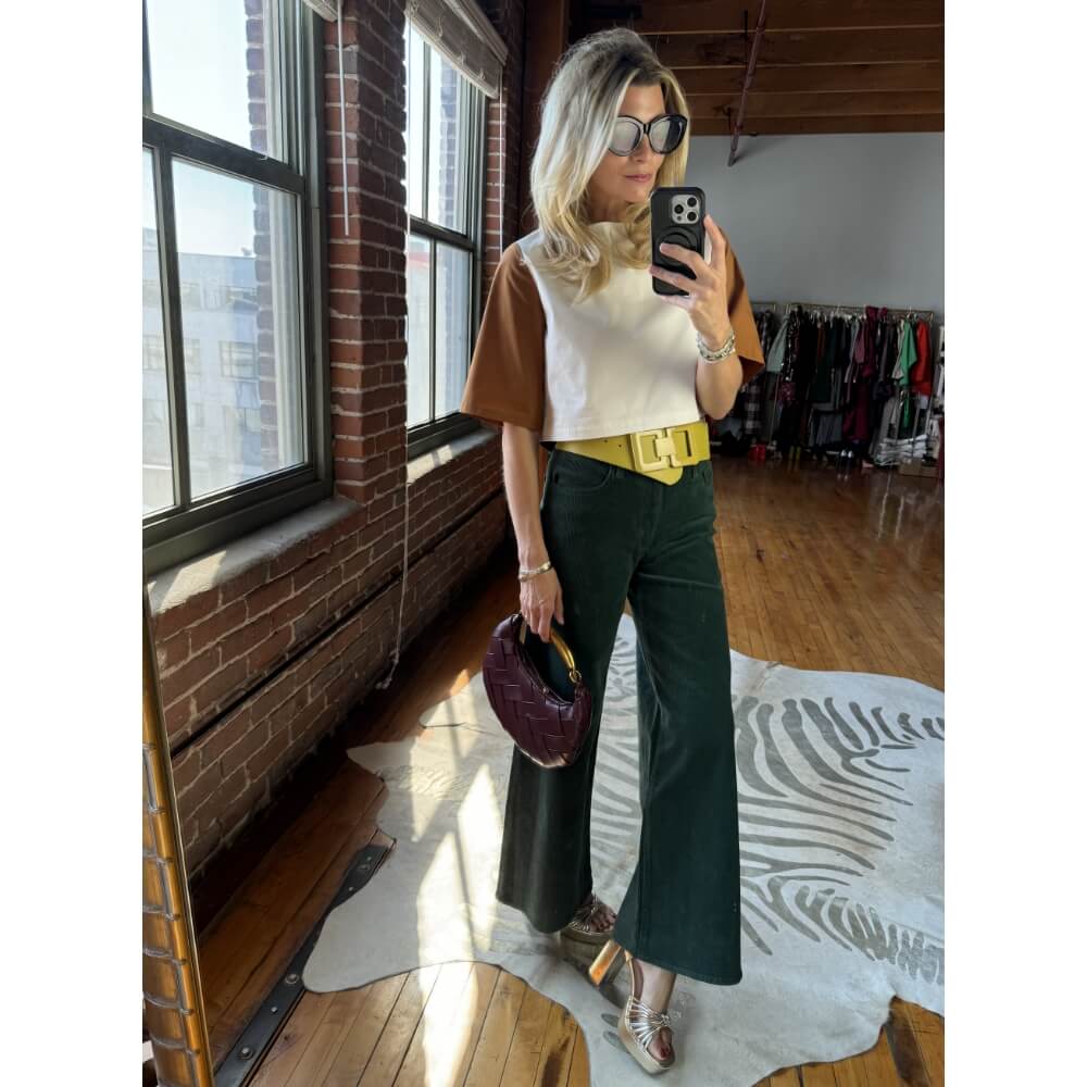Rust pairs so well with almost any color! Add in our bright chartreuse buckle belt with our green cords for pops of color. To mix it up even more, style it with our Oxblood Basketweave Handbag!
