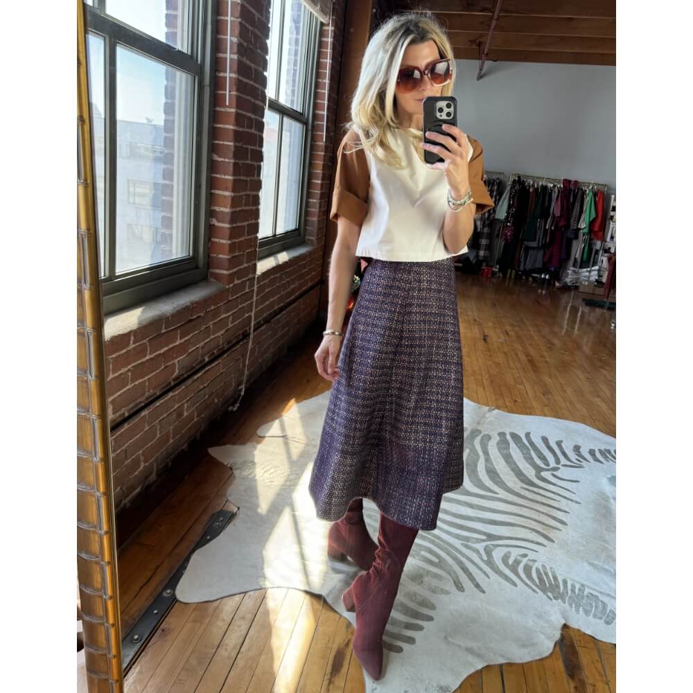 Continuing with the cranberry and navy theme here. Style the Rust box top with our Navy Tweed Midi Guest Skirt- the colors in the Box Top coordinate with the rust thread in the tweed of the skirt.