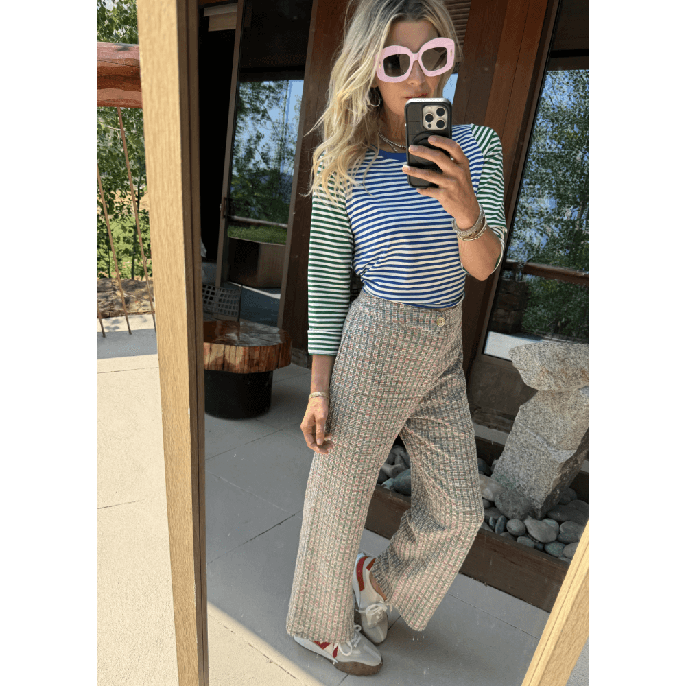 An all-day, everyday look. Add the Green & Pink Le Culottes to the contrast tee for a look that is comfortable and office appropriate. The greens in each piece pull the look together.