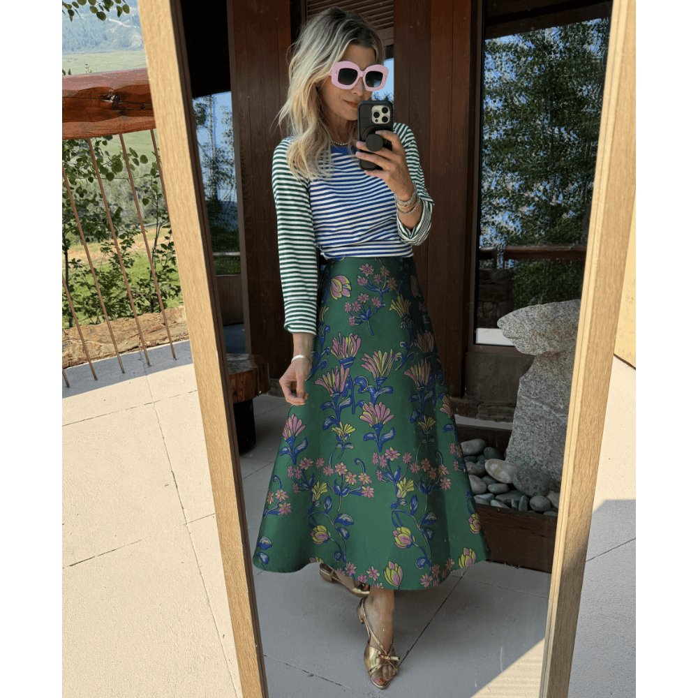 Dress up this bold, contrast tee by pairing it with our lovely Laura Skirt in green floral jacquard. The beautiful emerald hues tie this look together and the metallic gold sandals are the perfect pop.