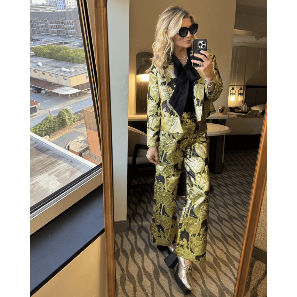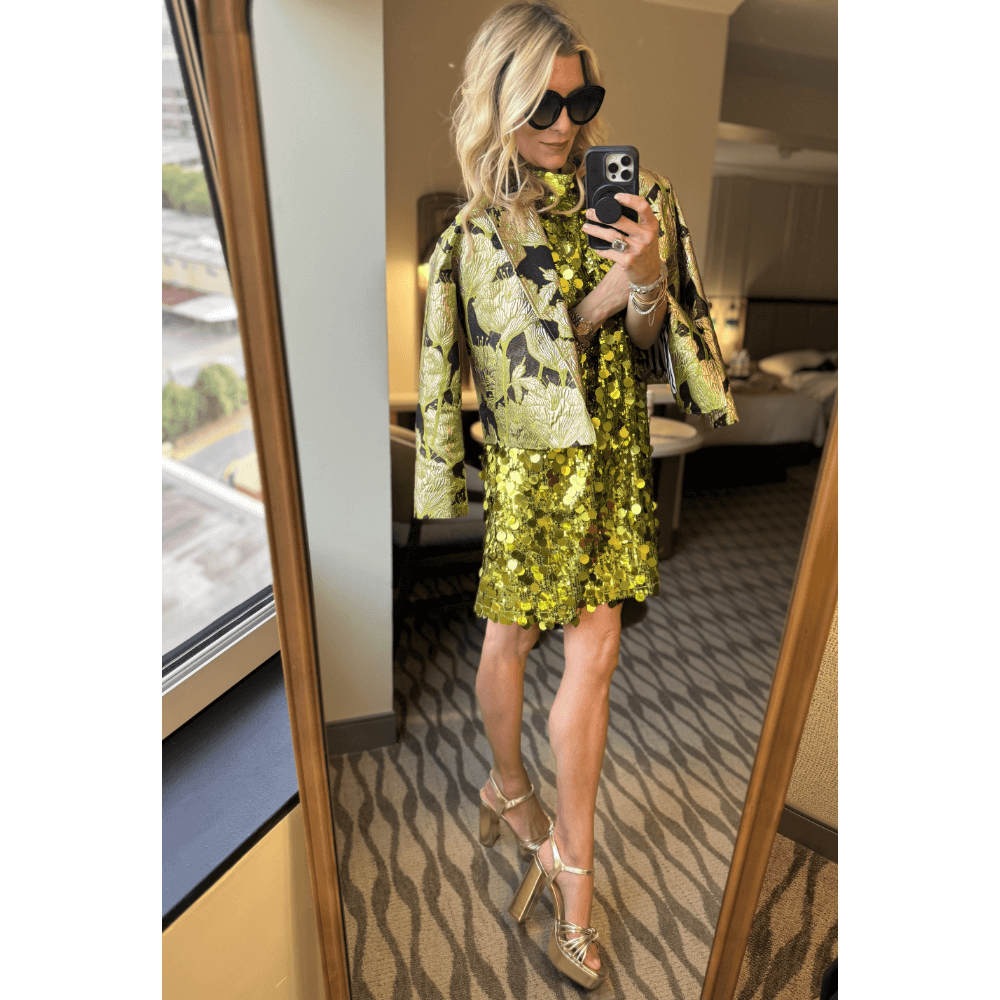 Looking for a cocktail blazer that makes a bold statement? Look no further! This black, gold and chartreuse metallic brocade number packs a punch! With a slightly boxy fit and a bit shorter length that our typical blazer, she's timeless with a twist! Pair her with either the matching skirt or pant for a power suit with major flair!