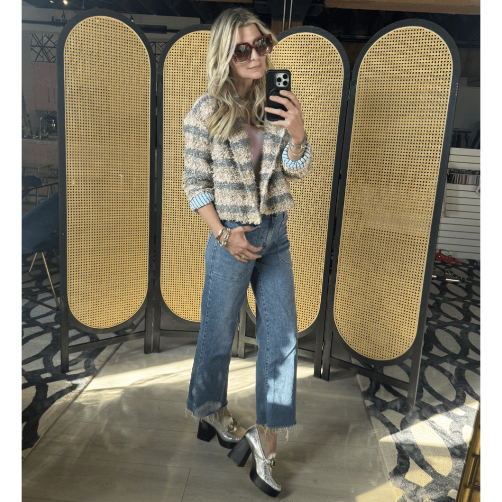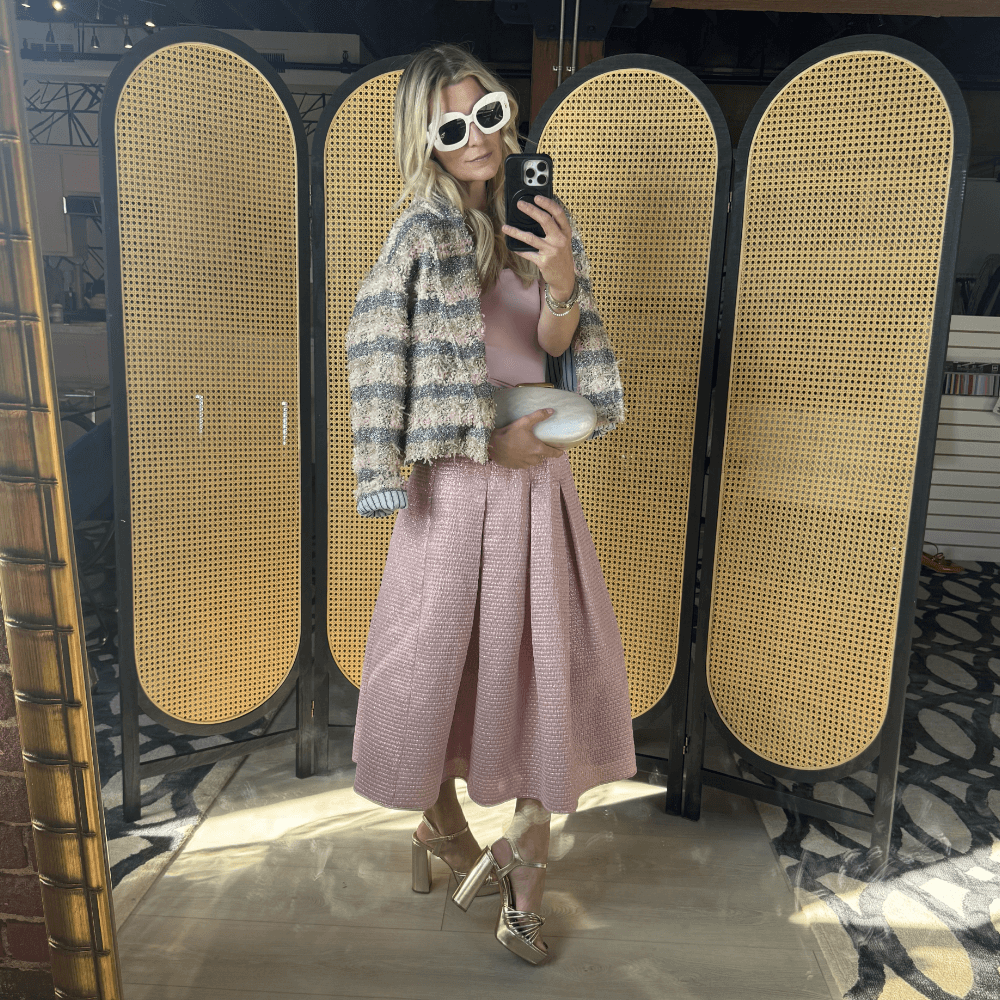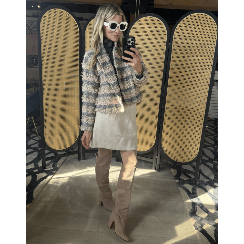 Create a dreamy winter color palette (and stylish look) by pairing our iridescent tweed Cropped Blazer layered over the sheer plaid Diane Turtleneck and Maggie Mini in Oatmeal Wave. A classic knee-high boot finishes off this look in a sophisticated way.