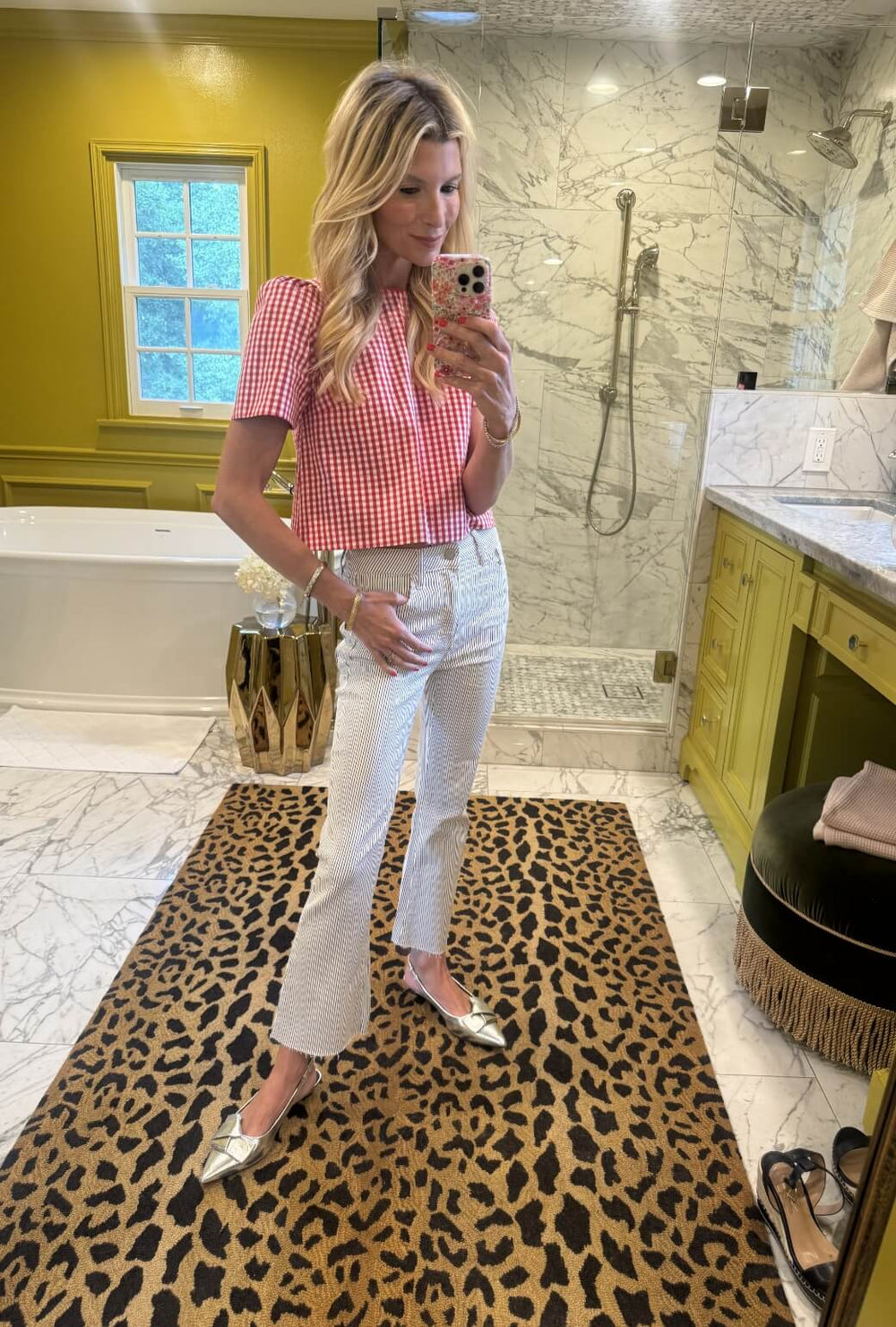 Show off a perfectly understated red, white and blue moment when adding our Red Gingham Lee Top to our fresh Railroad Stripe Cropped Flares.