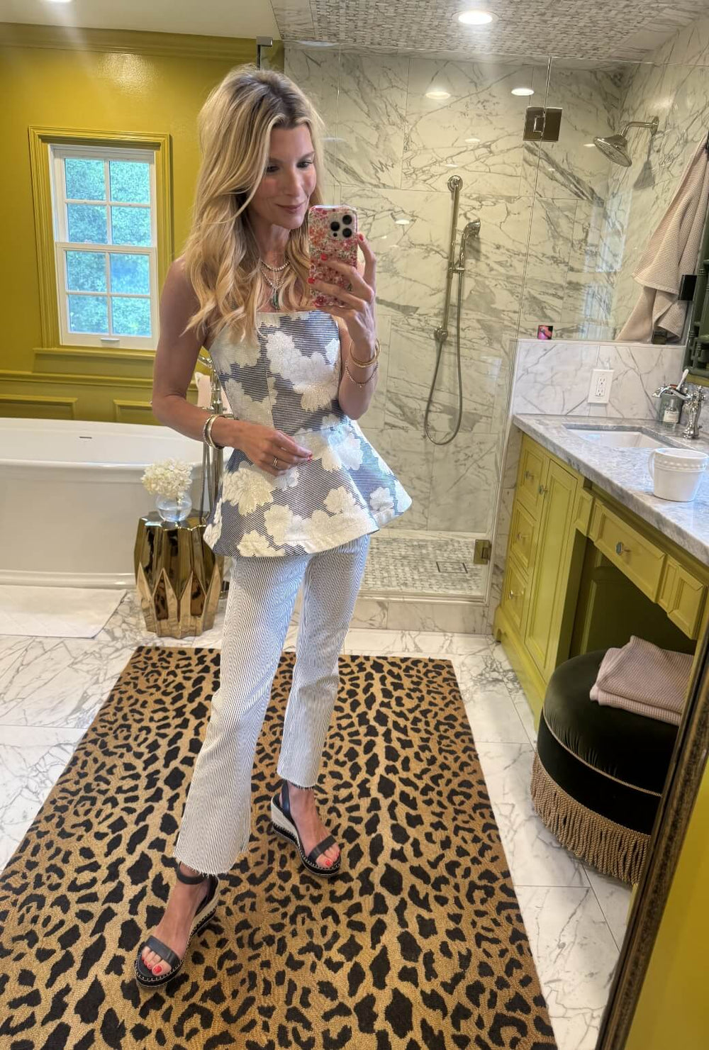 Stripes on stripes is the name of the game when styling our fave new denim with our Navy Floral Brocade Peplum Bustier. Whimsical, holiday ready and ever so chic.