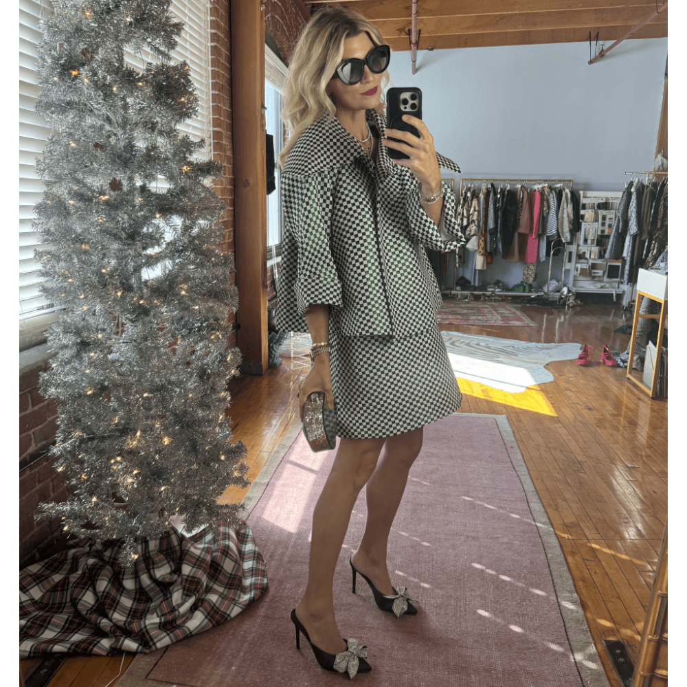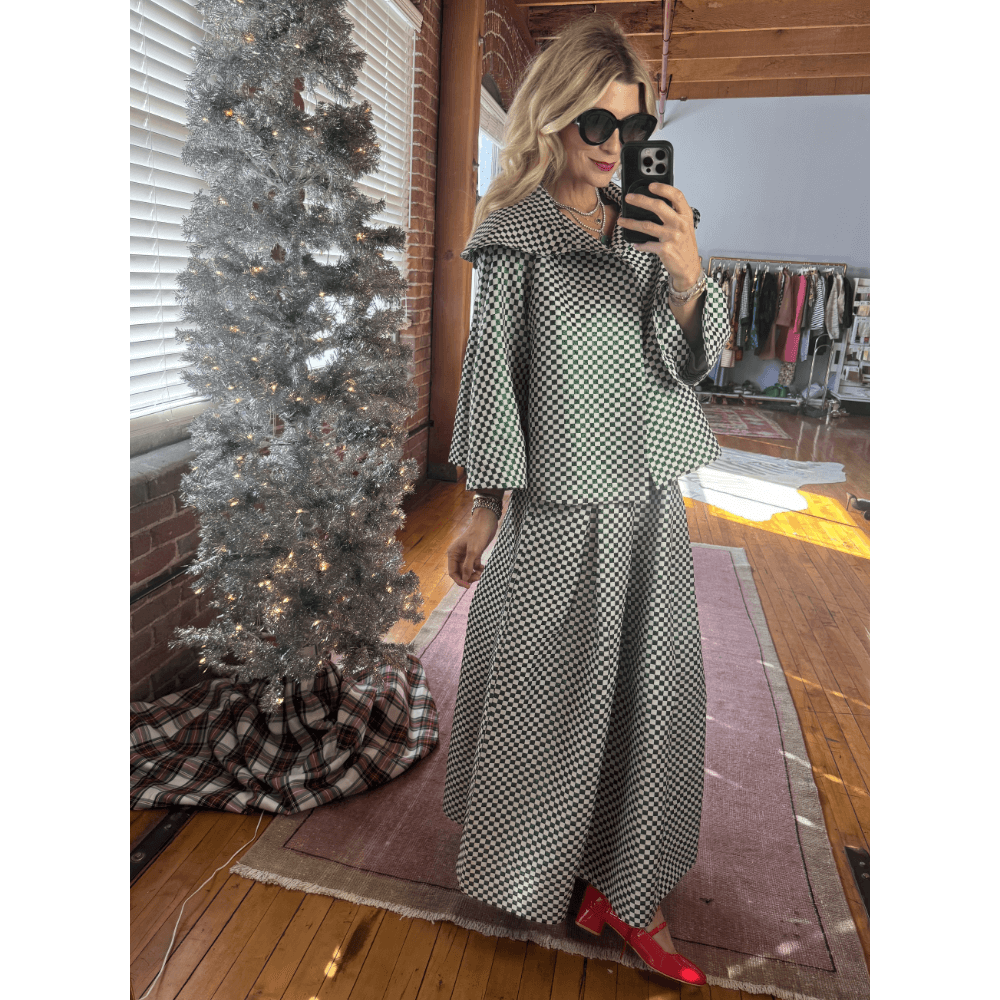 Pair the cropped Grace Coat with the Maxi Party Skirt in this shimmery checkerboard fabric for a bold look for your Holiday Party.