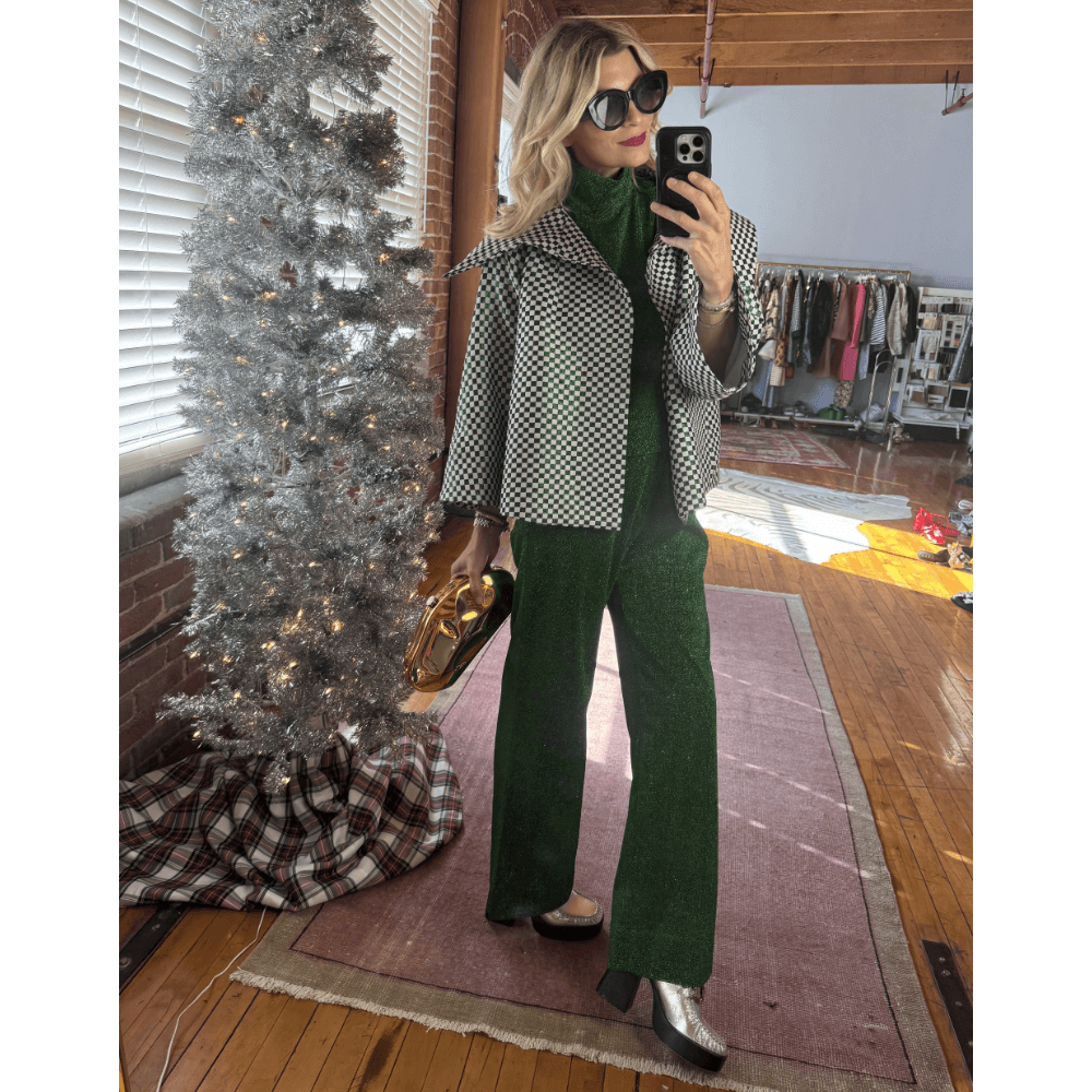 The Cropped Grace Coat makes a perfect topper for this matching green sparkle Trousers and Turtleneck. Pair with the statement-making silver Yves Loafers for a bold finish.
