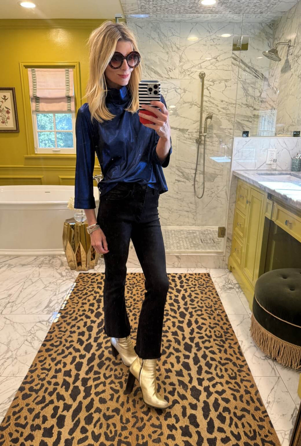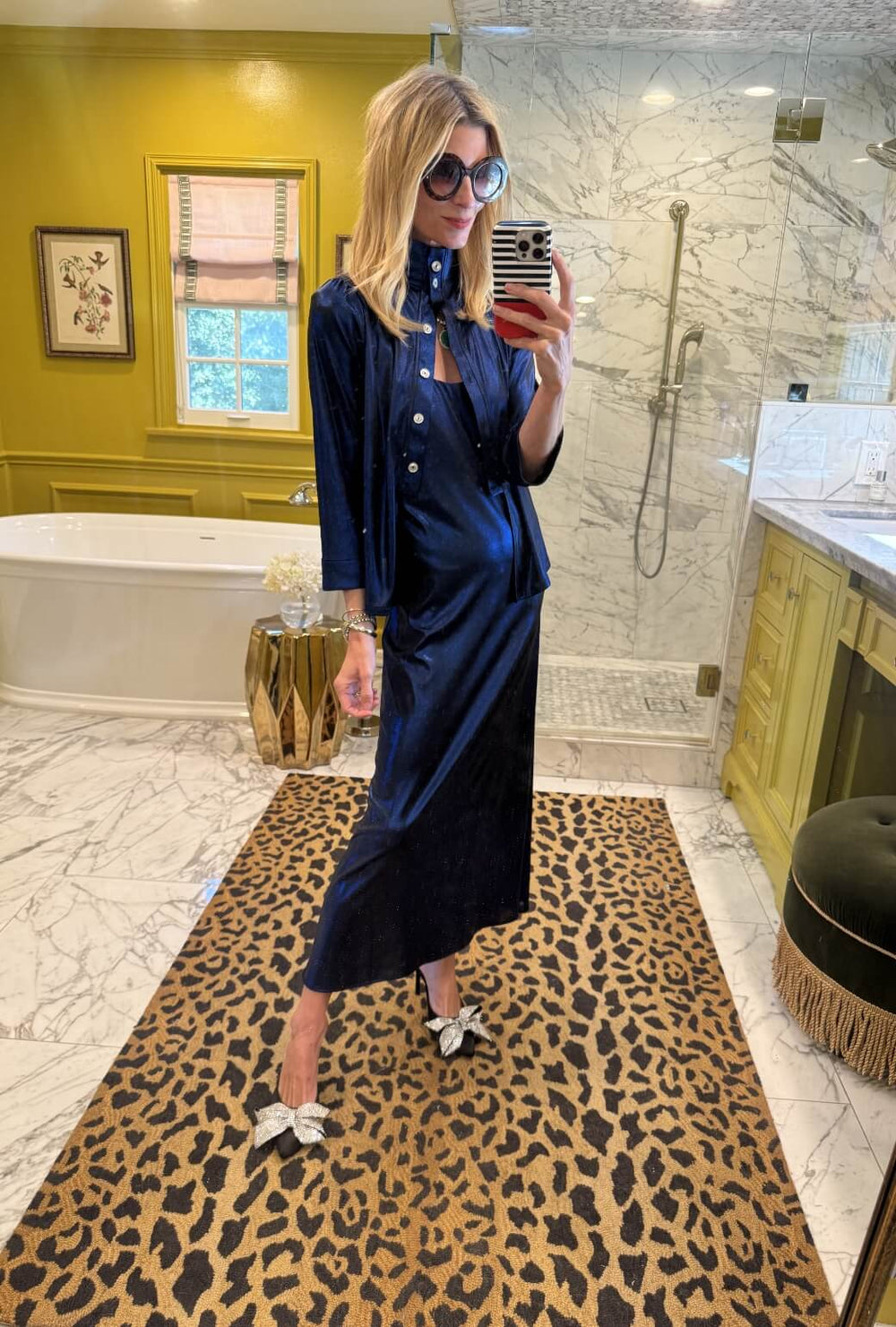 Pair the mod top with the matching mini, black tights, and rhinestone mules for a polished, head-to-toe shine. This combo creates a sleek, statement look that effortlessly transitions from dinner to dancing.