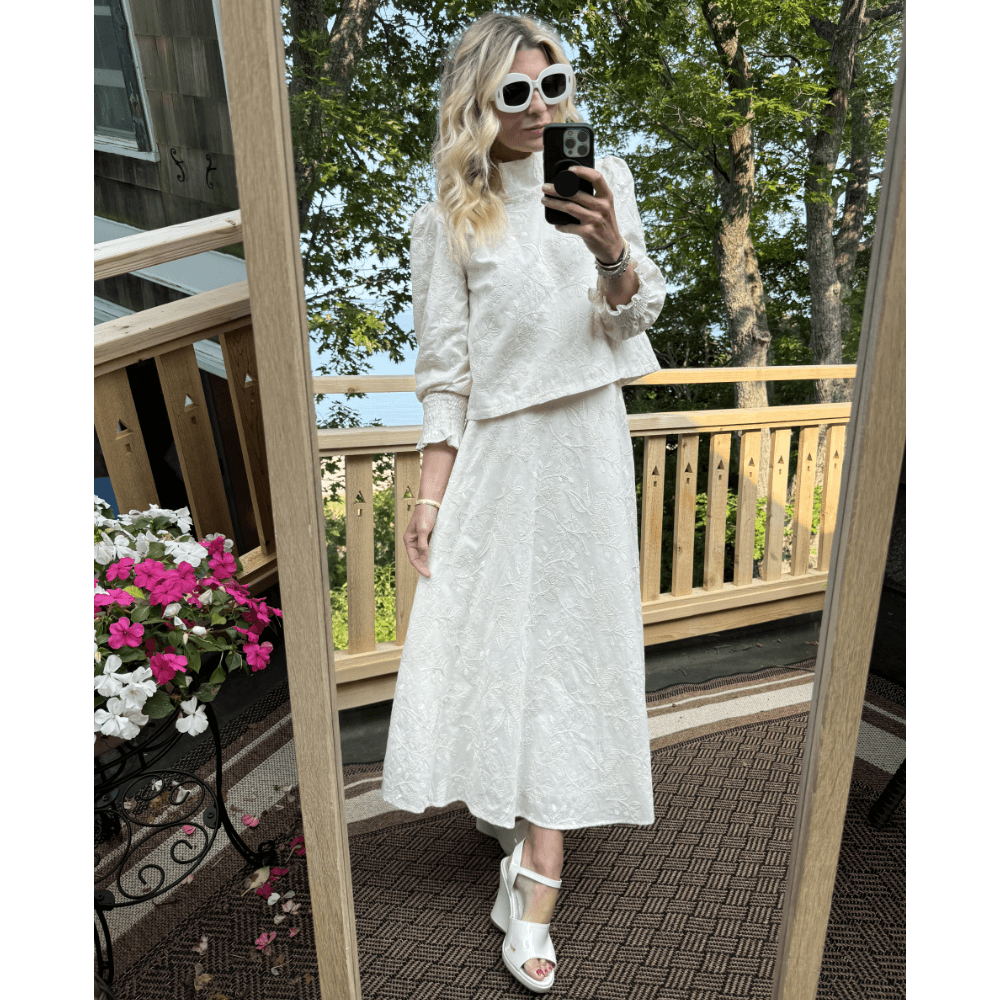 This ivory embroidery textile creates a gorgeous, ethereal matching set. The proportions of the Cropped Mod Top and matching Laura Skirt are flattering and easy to wear.
