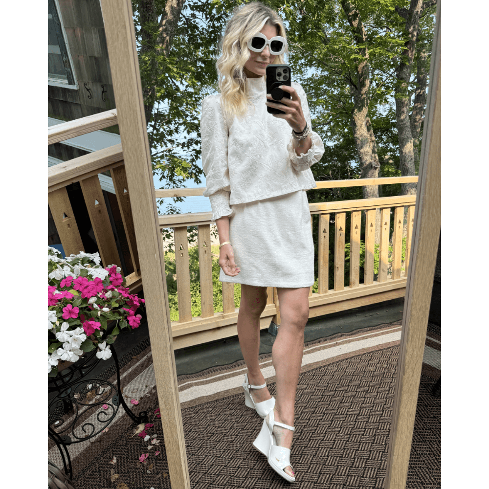 We love ivory as a year-round color, and even the "no white after Labor Day" purists can get behind it since it's not technically white. Add in a gorgeous embroidery and we are completely in love! In our Cropped Mod Top Silhouette with its slightly boxy fit, this top is perfect with your high-waisted trousers or jeans and creates a dreamy head-to-toe look when paired with her matching skirt - The Laura Skirt.
