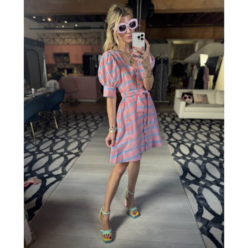 If you loved her maxi sister, but prefer a shorter length, our deep v mini puff sleeve day gown in blue stripe is for you! Day dresses are our secret weapon to getting out the door quickly while looking far more polished than time allows! With a puff sleeve, V-neck, and self-belt, this mini dress can take you from a morning meeting to an evening out with the simple shoe change . And this super lightweight striped fabric is a dream to wear all summer long.