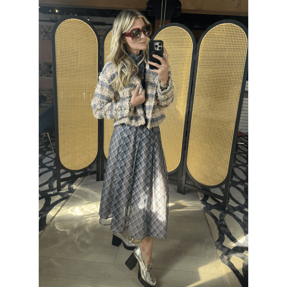 The colors in the iridescent tweed Cropped Blazer make it an easy layer over the sheer plaid Diane Turtleneck and Smocked Waist Skirt. The silver loafers are a fun finish for this look and color palette.