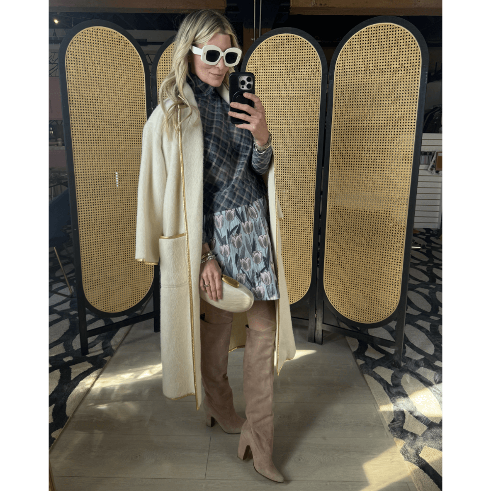We love a mixed print look. Style our Diane Turtleneck with our everyday mini skirt in Tulip Jacquard. The beautiful hues of blue are absolutely stunning together. For a cooler night layer on our ivory & gold Open Car Coat.