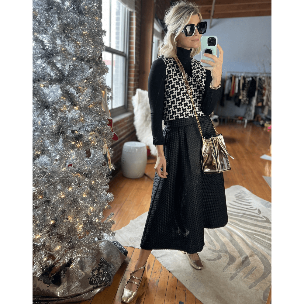 Bold square shades elevate an elegant daytime skirt and blouse.
