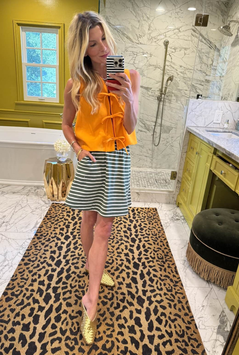 Add our orange Fife Vest with this green stripe mini and you have Buru's take on color blocking. Perfect for daytime errands, meetings at school or lunch with friends. This citrus combo is hard to top.