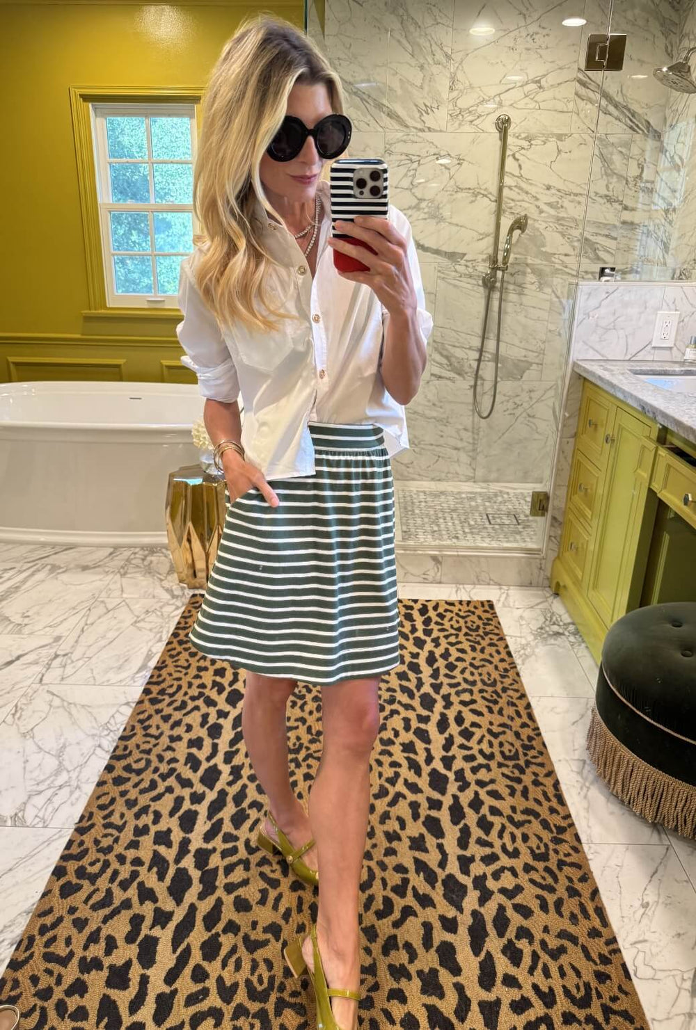 There are few looks we love more than a crisp button down with a coordinating skirt. Our cropped Mel in white is a chic match for this darling mini.