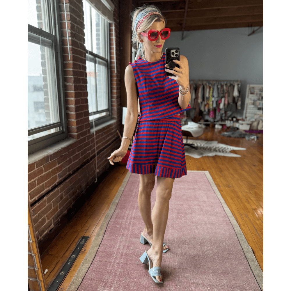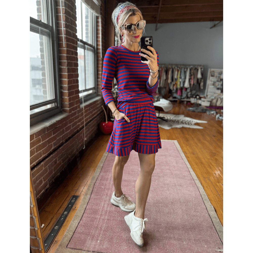 An elastic waist skirt made of the softest knit in a classic blue and white stripe? Yes, please. This comfortable beauty is fun, flirty and perfect for your summer occasions. Based on what you prefer, you can pair her with the matching long sleeve crew neck tee or button box top - or buy both, and mix and match as you please!