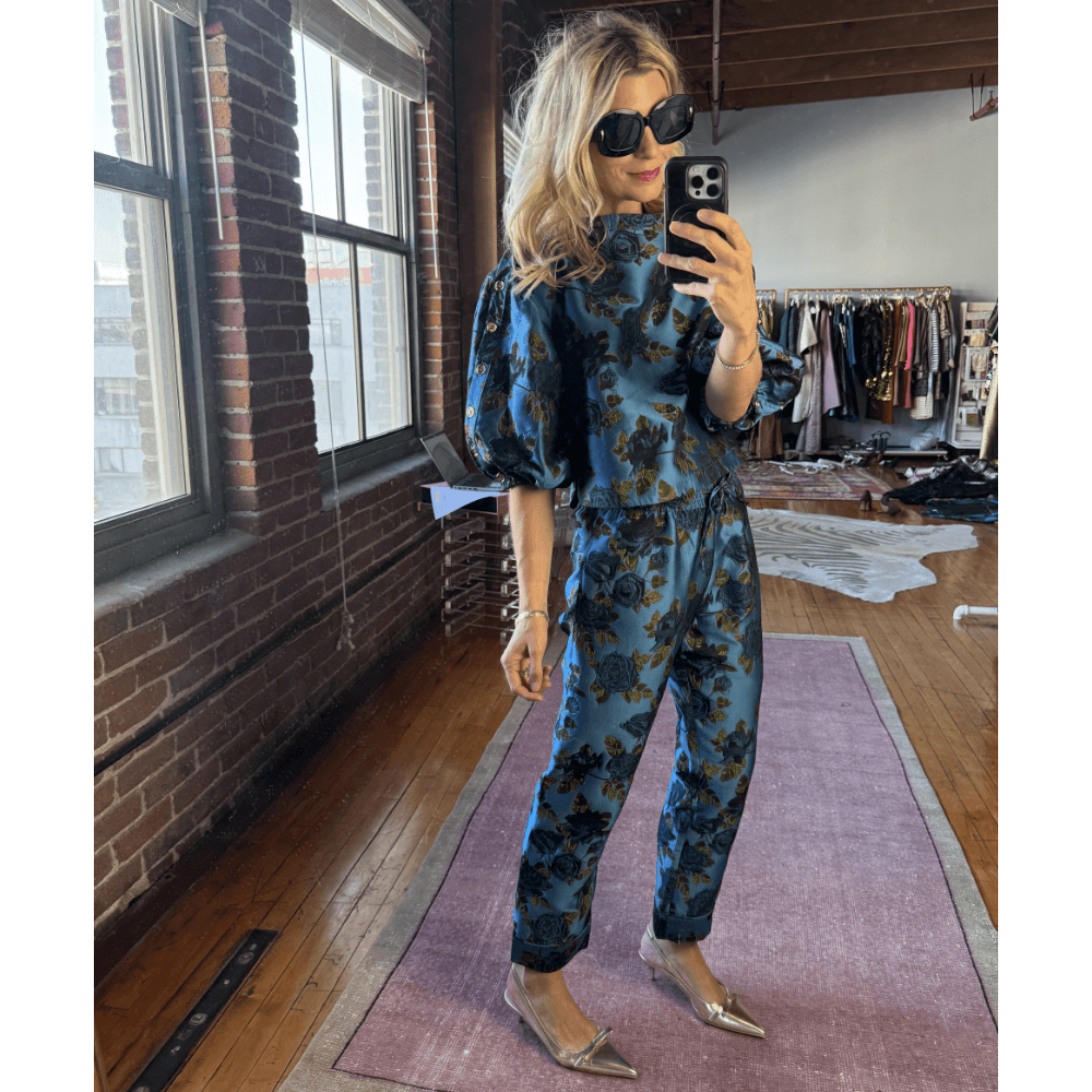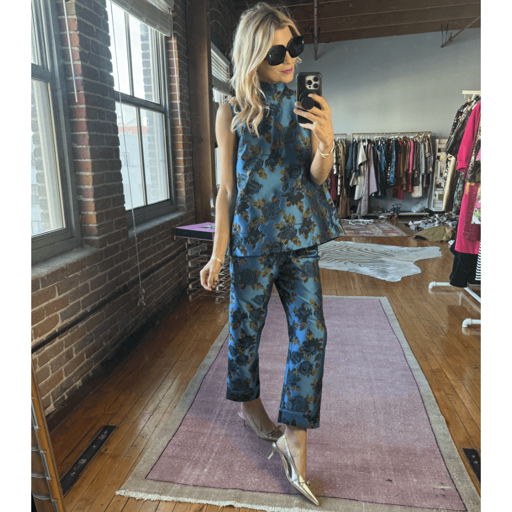Comfortable and chic at the same time? Sign us up! With a drawstring elastic waist, pockets, and the most beautiful (and slightly moody) blue rose jacquard, our Everyday Pants are named appropriately and meant to be enjoyed..."everyday". Cropped at the ankle with self-piping detail and a hemline band. Pair them with their matching Sleeveless Mod Top or Cropped Button Sleeve Blouse.