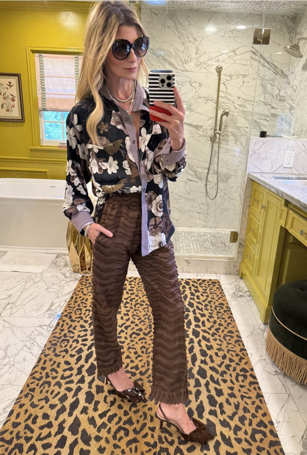 A loose silk blouse paired with our brown fringe pants creates a beautiful play on texture and movement. Soft meets statement in a look that feels relaxed, refined, and ready for wherever the day leads.