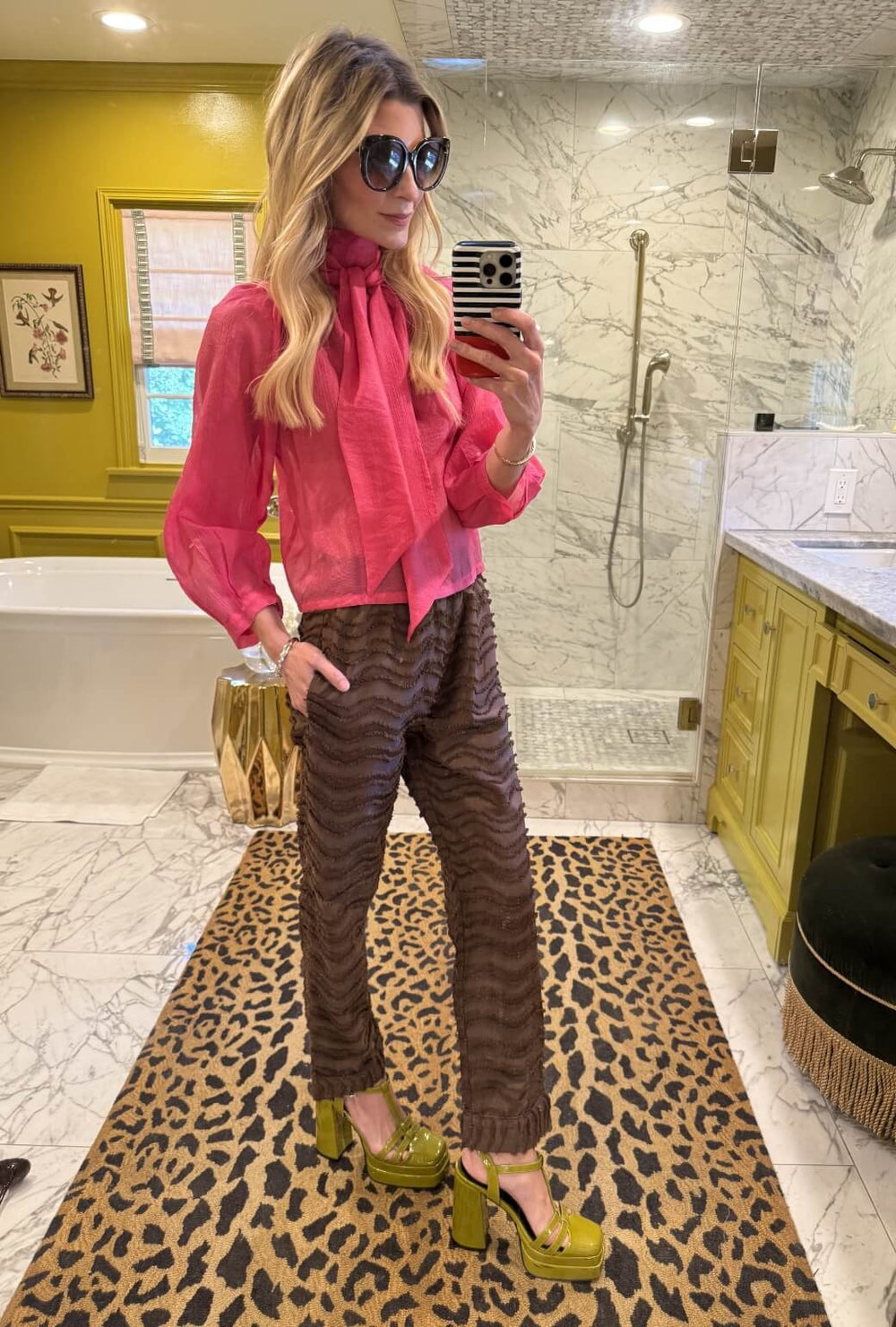 Our Pink Silk Bow Blouse takes on a fresh twist when worn backward, with the buttons left open in the back for an unexpected detail we love. Styled with the brown fringe Everyday Pants, it’s a playful mix of softness and texture that makes a chic statement.