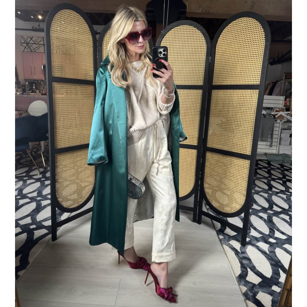 For a fun pop of color, add our green satin Evening Coat on top of the matching ivory Everyday Pants and Long Sleeve Mod Top.