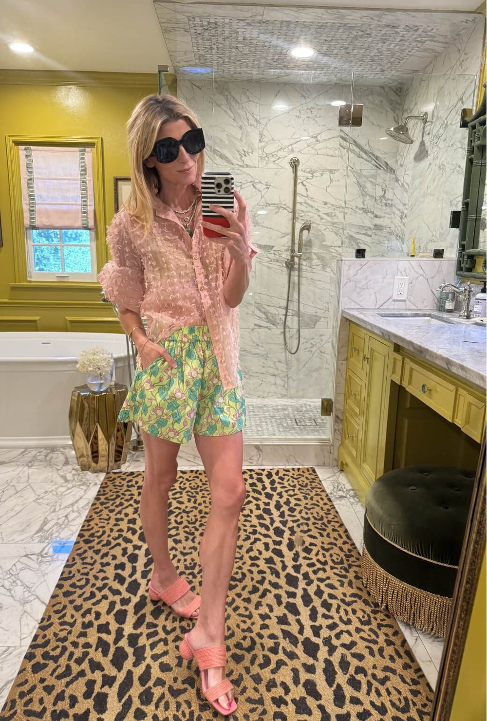 To mix up the lotus flower print - and to dress up the look a bit - add our Mel Button Down in blush bows.