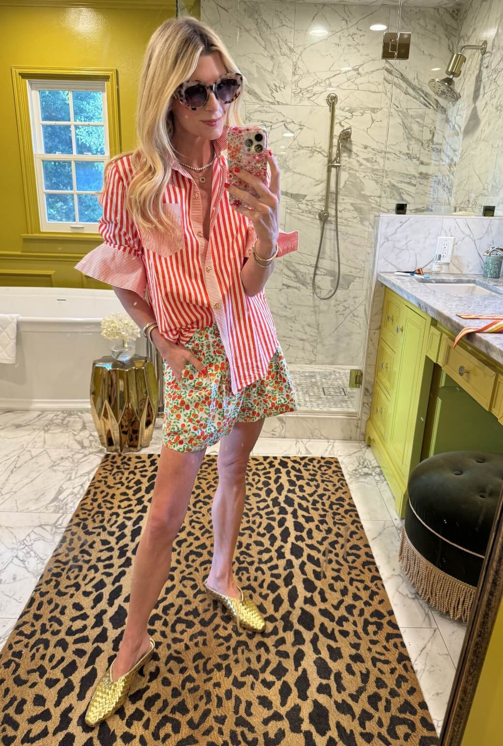 Prefer to mix up the citrus print, add a coordinating stripe for a fun change up. Our classic Mel Mixed Button Down in tangerine stripe is an easy match to the oranges.