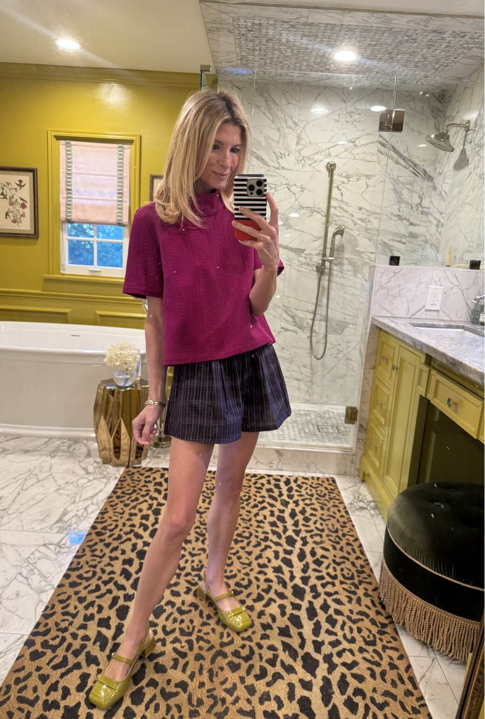 Add a dose of playful polish to your wardrobe with the Everyday Shorts in purple plaid. Crafted in a lightweight cotton blend with rich purple and navy plaid, they’re designed for comfort without sacrificing style. Pair them with the matching Mandarin Button Down for a coordinated look, or add a pop of color with a contrast top. When the temperatures dip, just layer on your favorite sweater (we love the navy Olive Fringe) to keep the look cozy and fresh.