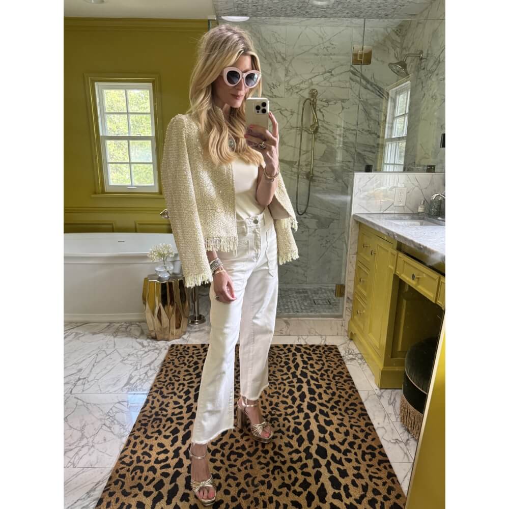 We love elevating everyday denim with a classic blazer—and the Mona Lee does just that. Her Ivory Twinkle Tweed adds a polished pop to even the most laid-back look.