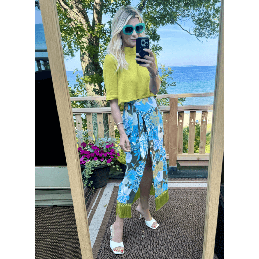 If matching sets are not your favorite, the chartreuse Twiggy Top makes a great match to the Fringed Sarong. Because the sarong is high waisted, the cropped fit of the Twiggy Top is the perfect length.