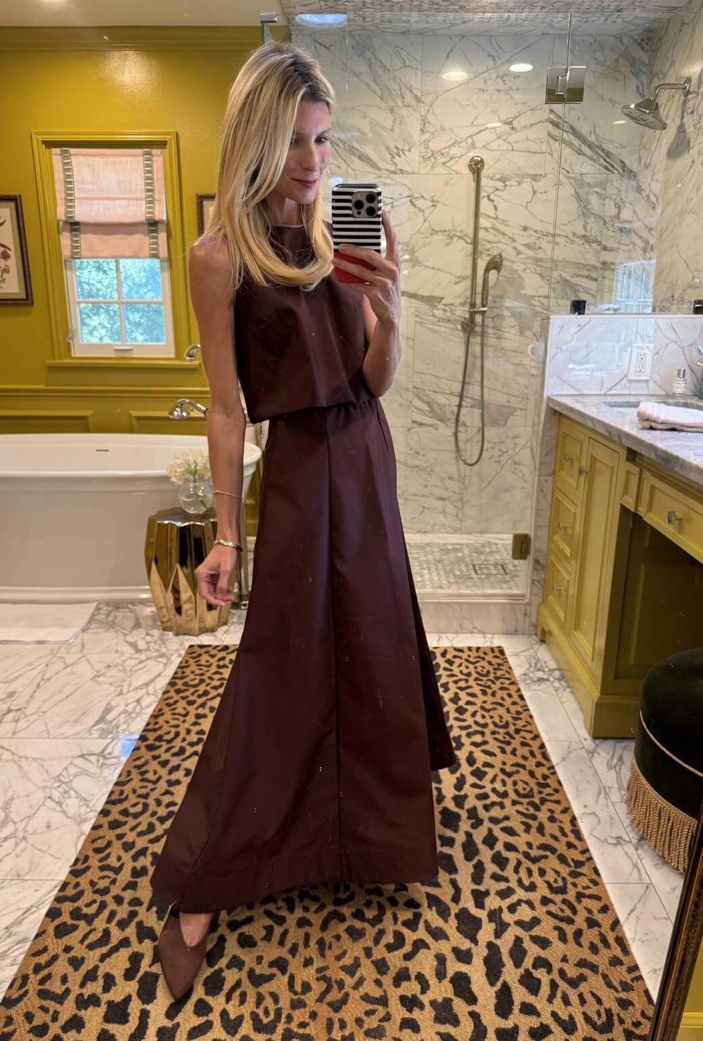Black tie approved! The matching Audrey Top and Guest Skirt combination will make a stunning entrance at your next special occasion. The brown taffeta is sophisticated and the contrast light plum-colored trim is an elegant detail.