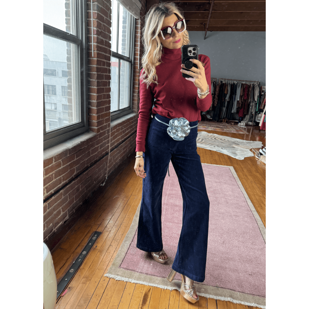 For an easy look, pop on one of our Diane Turtlenecks with the navy Sailor Cords (we love the navy/garnet color combo). And this ice blue leather flower belt adds a fun pop of color to this casual look.