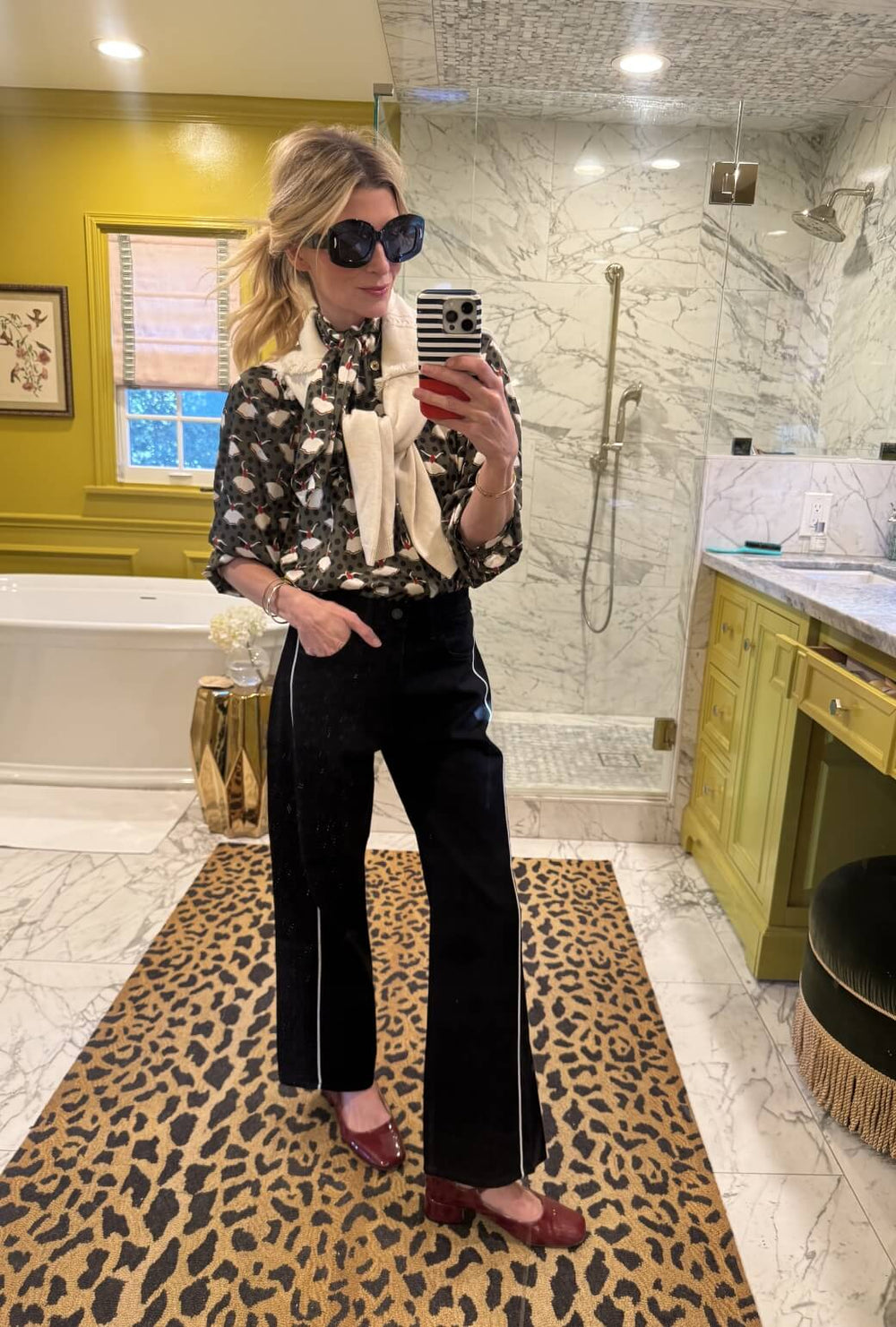 Our Dancing Ladies Bow Blouse add a hint of whimsy to these novel jeans. Add our Olivie Fringe Sweater and Mary Jane to finish the look.
