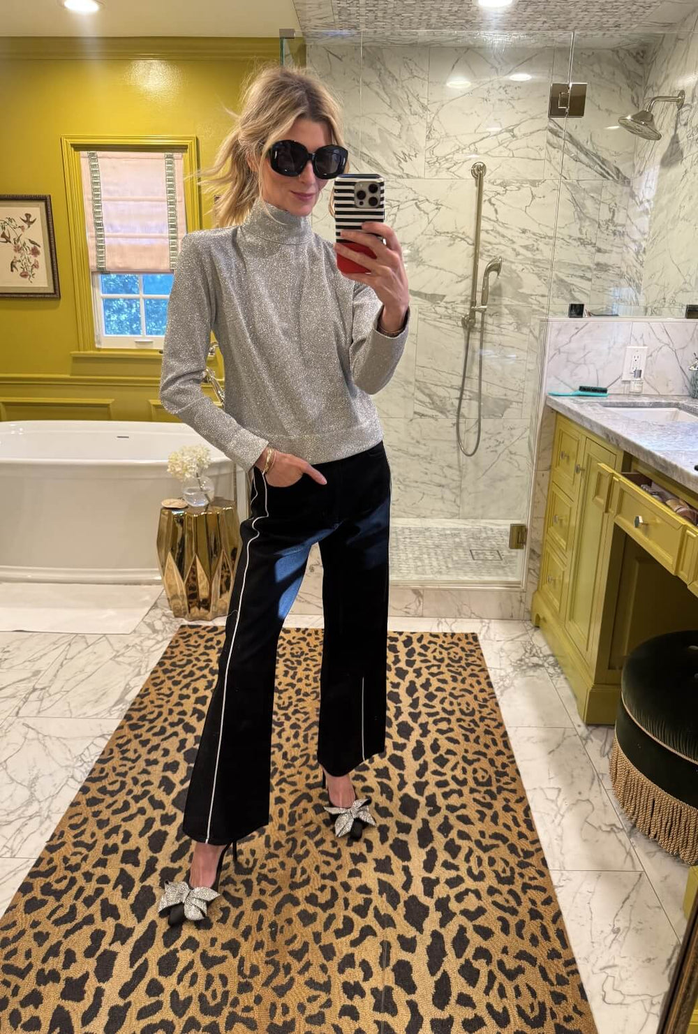 Dress these tuxedo inspired jeans up with a little sparkle. Add our signature rhinestone bow mules in black for the finishing touch.
