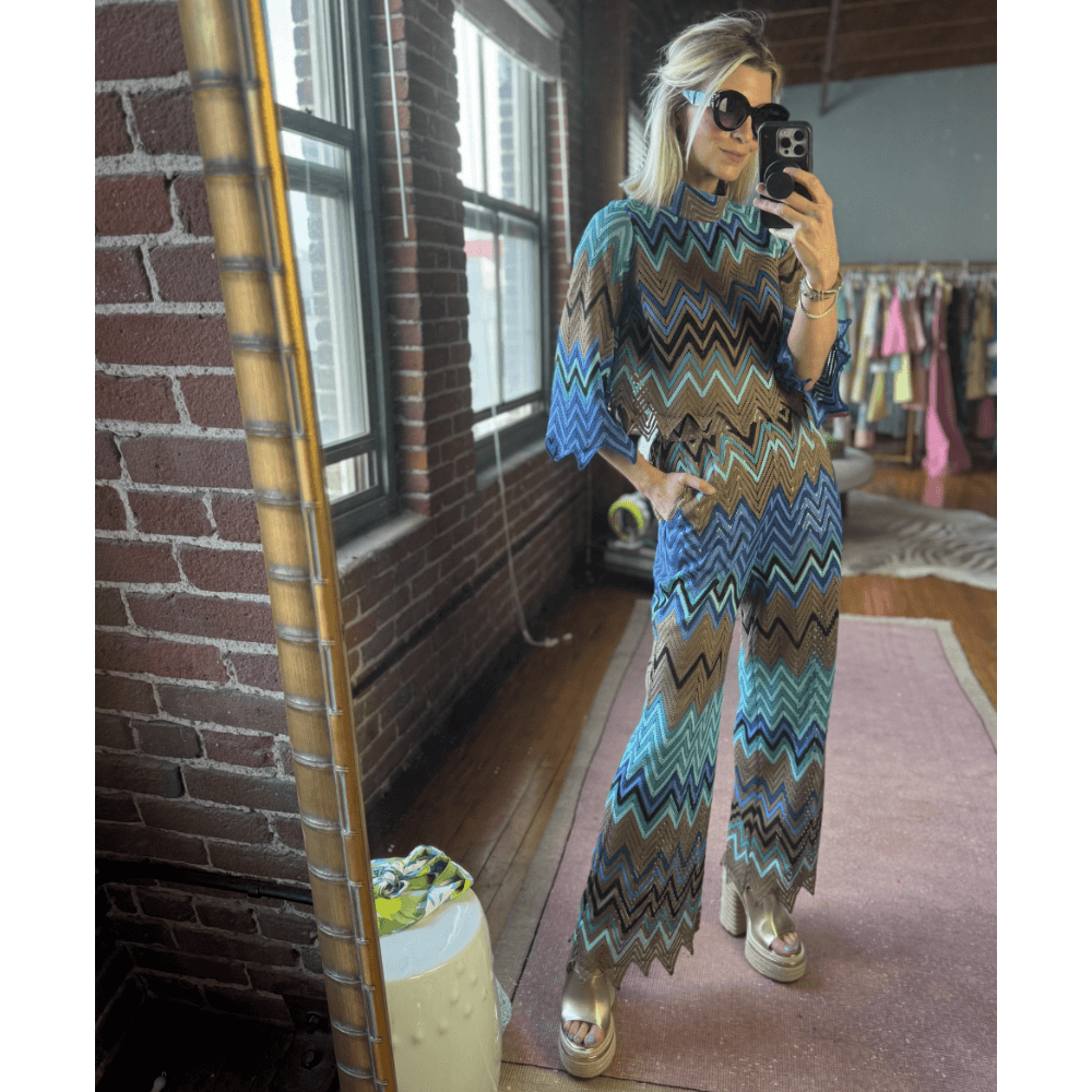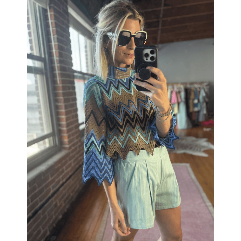When a Mod Top meets the ultimate mod fabric? Pure magic! This cropped Mod Top is a stunner in a mix of blue, aqua and brown toned flamestitch print. The cuffed sleeve and cropped hem are left intentionally jagged along the pattern of the print and the see through fabric creates a flirty peek-a-boo moment. Wear over a black bra for a flirty night out, layer on top of a black bathing suit for the ultimate resort chic ensemble, or add a black camisole for more coverage - whichever way you choose, you can't go wrong. Pair back to her matching (also peek-a-boo) pant for a bold look!