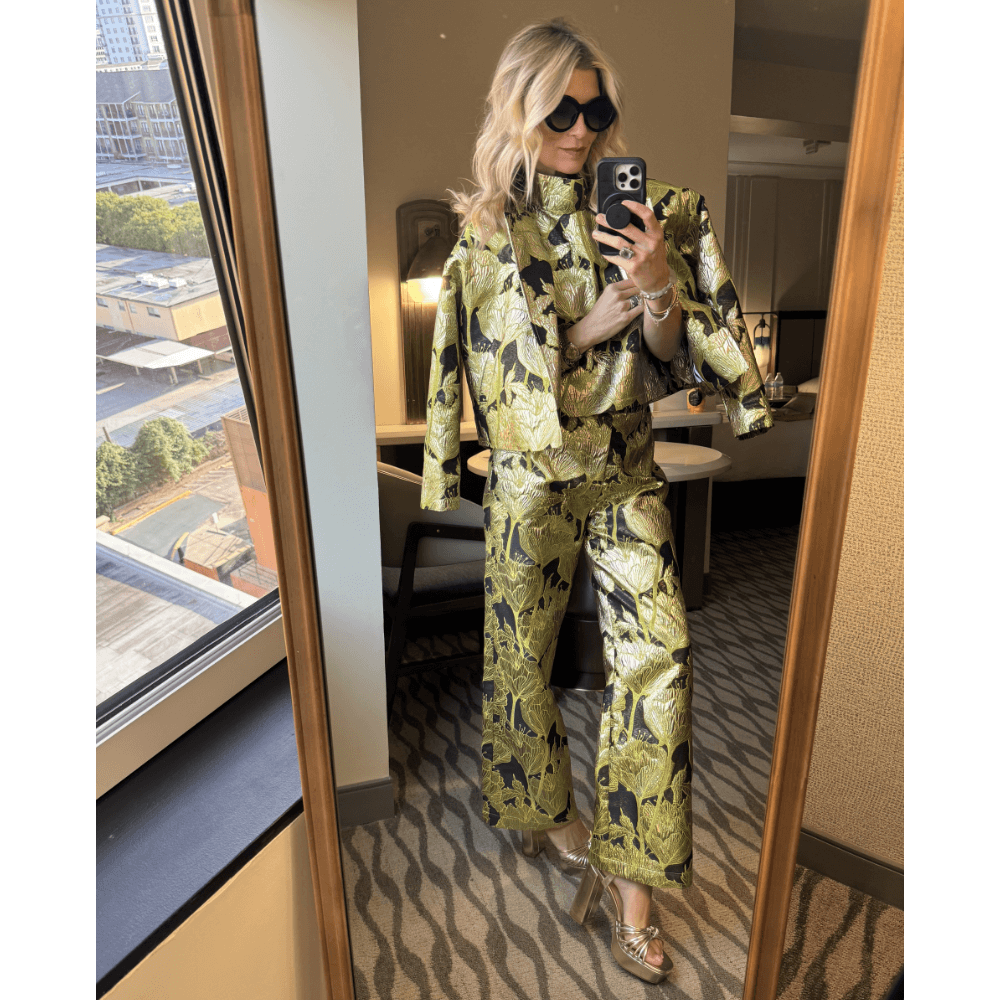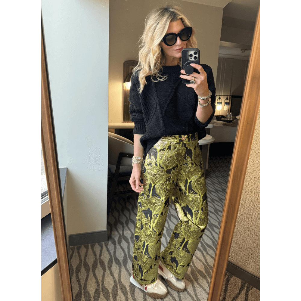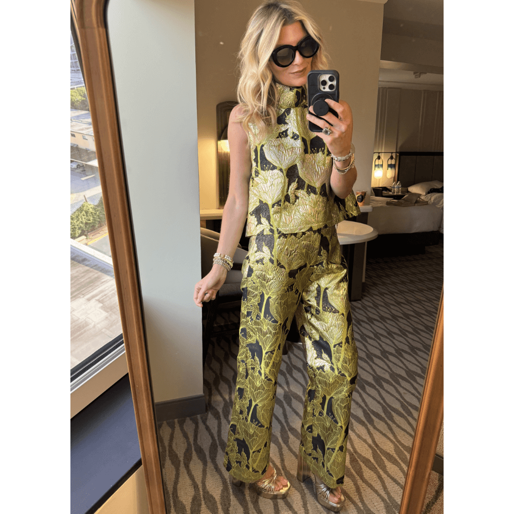 Since introducing our Le Culottes in 2023 we've fallen in love with the fit and versatility of the silhouette. In fact, we are so in love, we decided to introduce them as a full-length pant! So... while they aren't technically a culotte, we kept the name intact to make sure it was obvious that the fit was the same with just added length. The same elastic back waist, flat front and pockets that you love, just now in a full-length style. And this chartreuse and black metallic brocade is perfect for festive dressing - we adore it styled with the matching Mod Top and Boyfriend Blazer for a bold head-to-toe look.