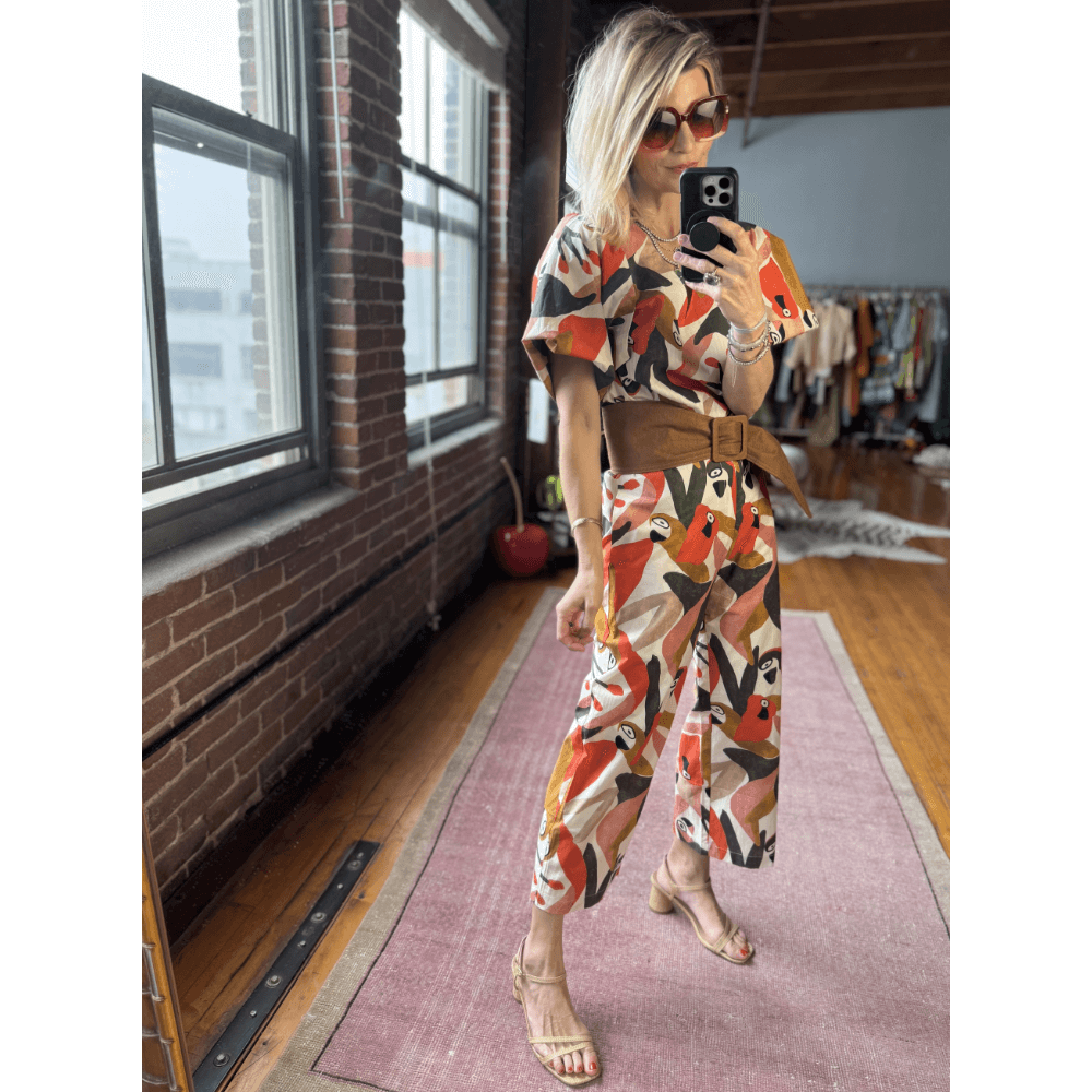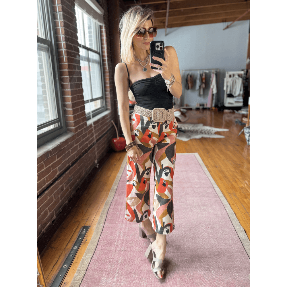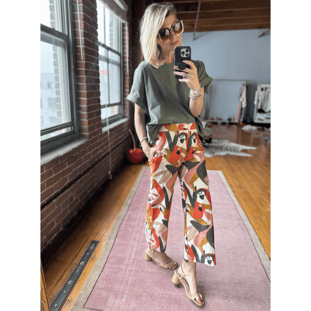 Our Le Culottes silhouette is an easy trouser to add to your wardrobe. Cropped in length with a flat front, elastic waist in the back and pockets, these beauties are elevated but comfortable...what more could you ask for? A colorful, playful summer print? Okay, happy to make that happen, too. Pair with the matching Bell Sleeve V Neck Top for a head to toe parrot party!