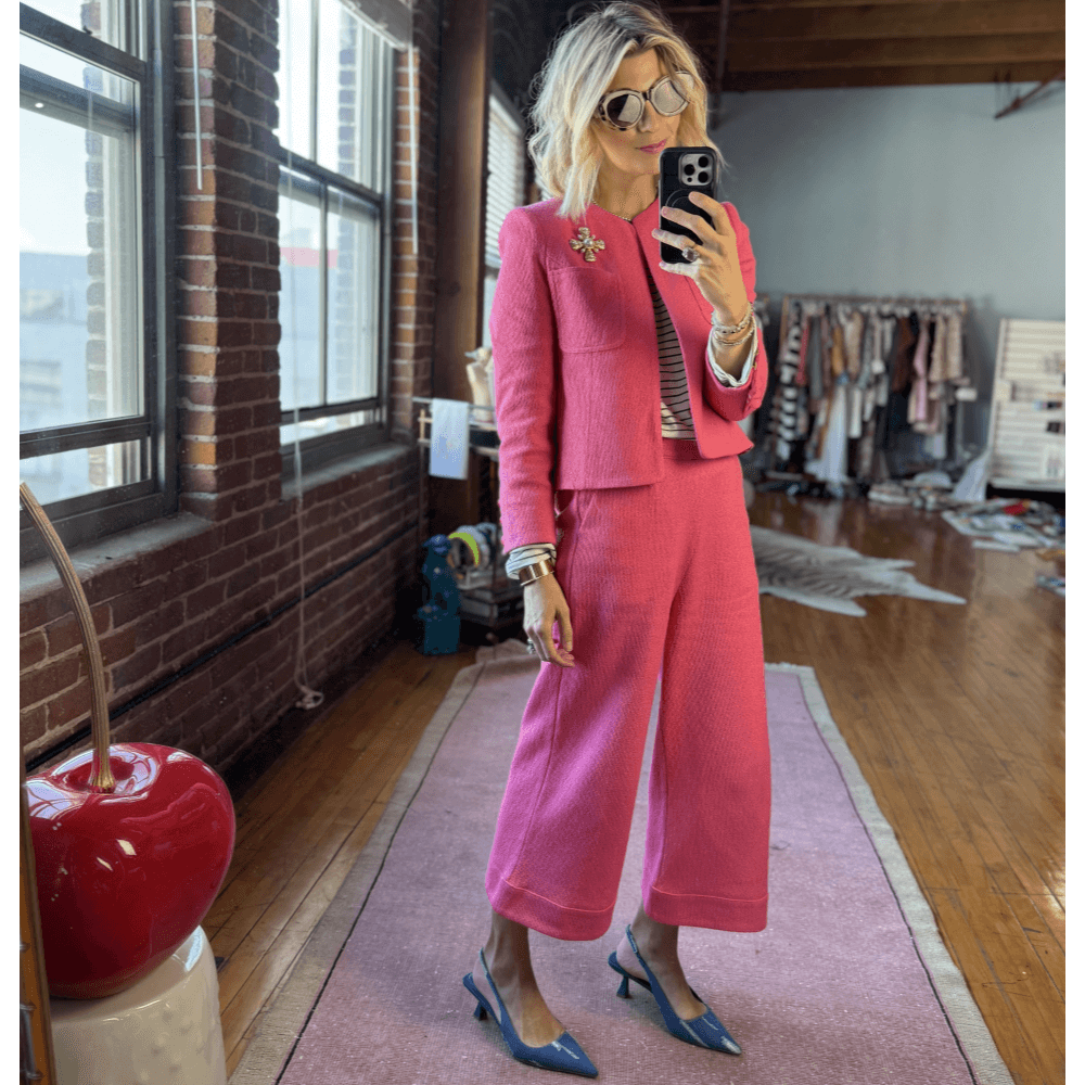 This classic pearl and gold brooch is a chic accent for the ultimate pink power suit.