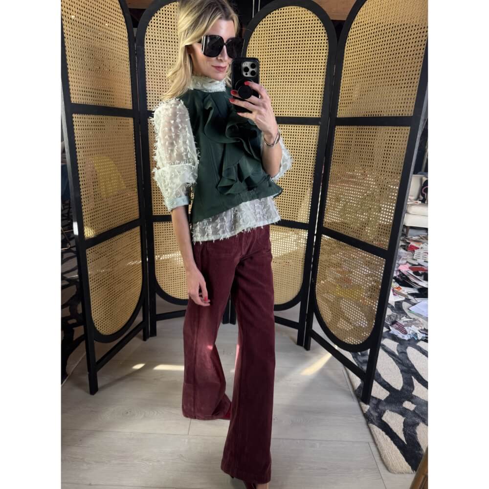 We love to layer! The jade moiré Ruffle Top layered over our Big Bow Blouse in mint green makes a stunning, but casual, look - dressed down with our high rise corduroys in cranberry.