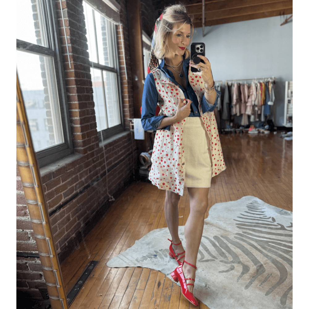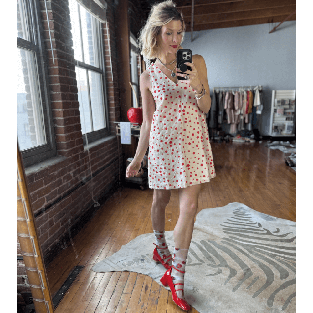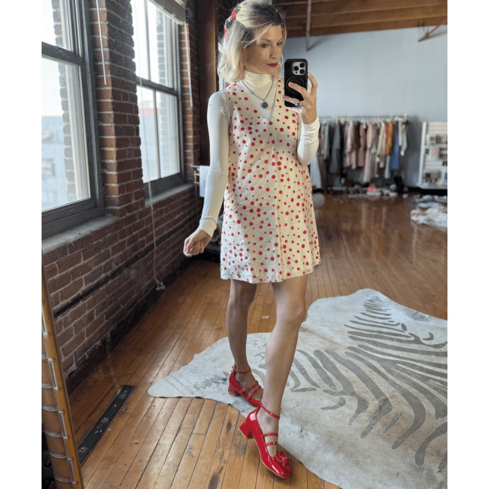Layering a sleek turtleneck in ivory under the Le V Mod Dress makes this an easy transitional styling. The red polka dots truly pop among the perfectly matched ivory foundation and are accented by the red patent Mary Janes and Le Scarf tied in your hair.