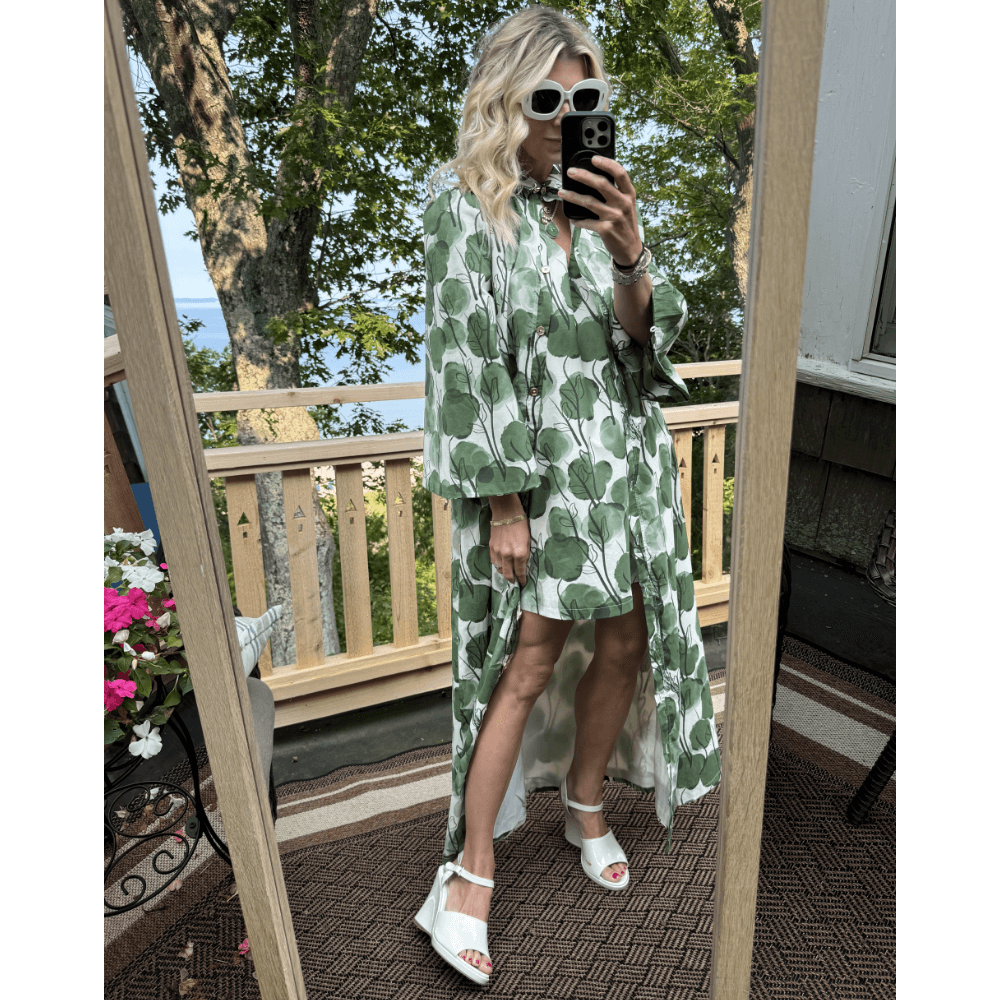 If you flip the dress around with the buttons in front, it becomes a gorgeous duster. Here we have layered it over the Le V Mod Dress for a matching set.