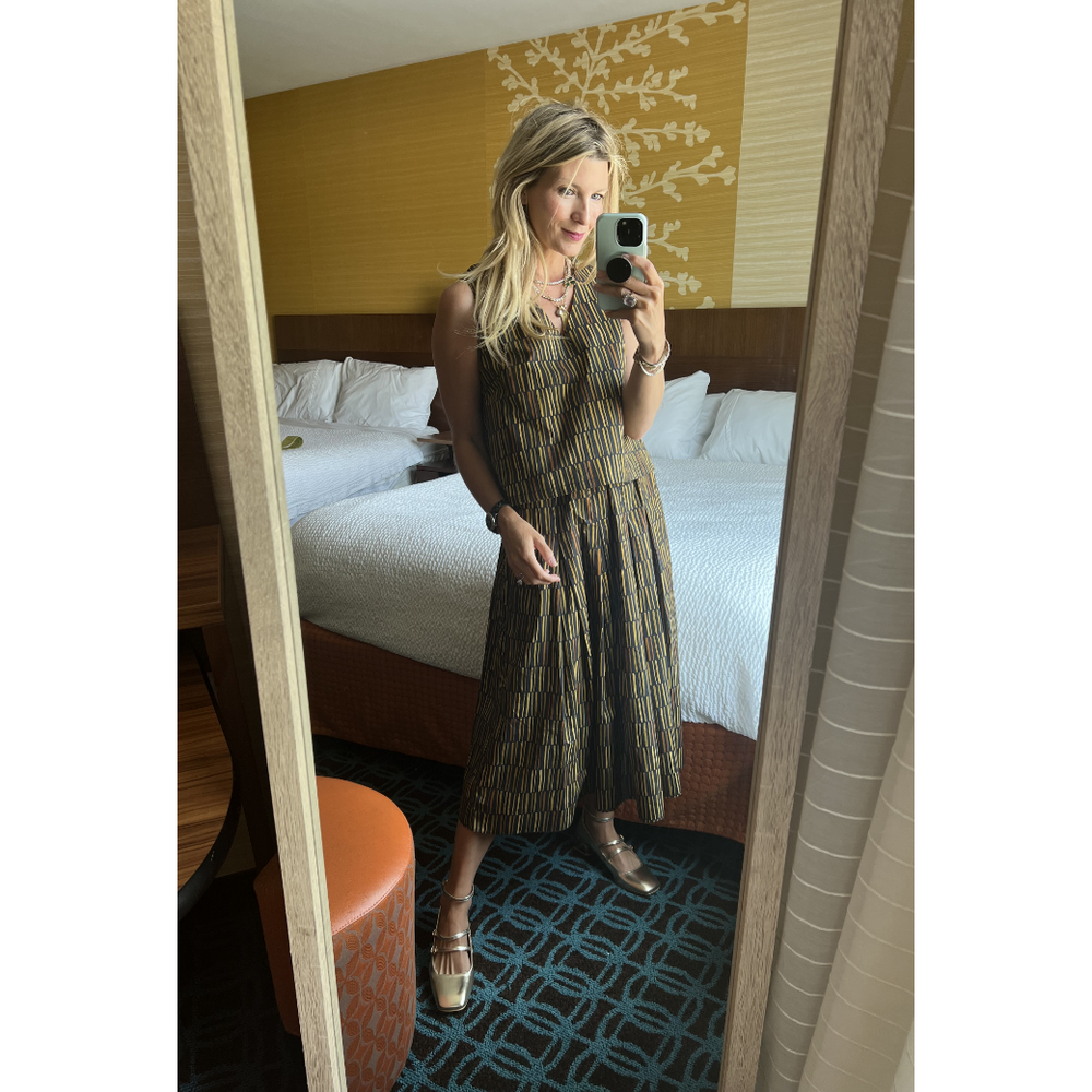 An easy way to style this top is with the smocked waist midi skirt in the matchstick print. Add some fun shoes like our gold Mary Janes and Voila!