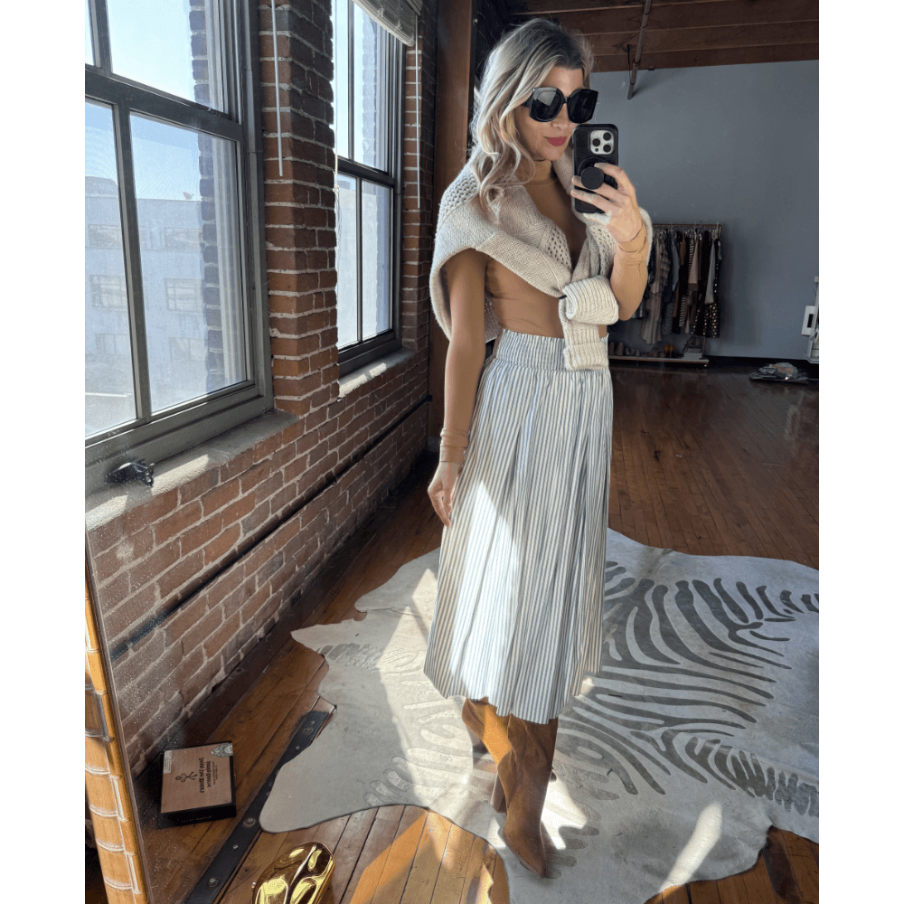 This dreamy color palette screams cozy winter! Pop on the Smocked Waist Skirt atop this slim fit turtleneck and our our Faux Suede Bourbon Knee High Boots for an easy look. A casual shoulder drape of the Oatmeal Fisherman Sweater finishes this look perfectly.