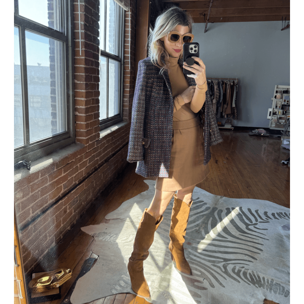The perfect layering piece - especially under a blazer. Case in point, our Cranberry Tweed Boyfriend Blazer. And we love how the Maggie Mini Skirt creates a monochromatic foundation for this look.