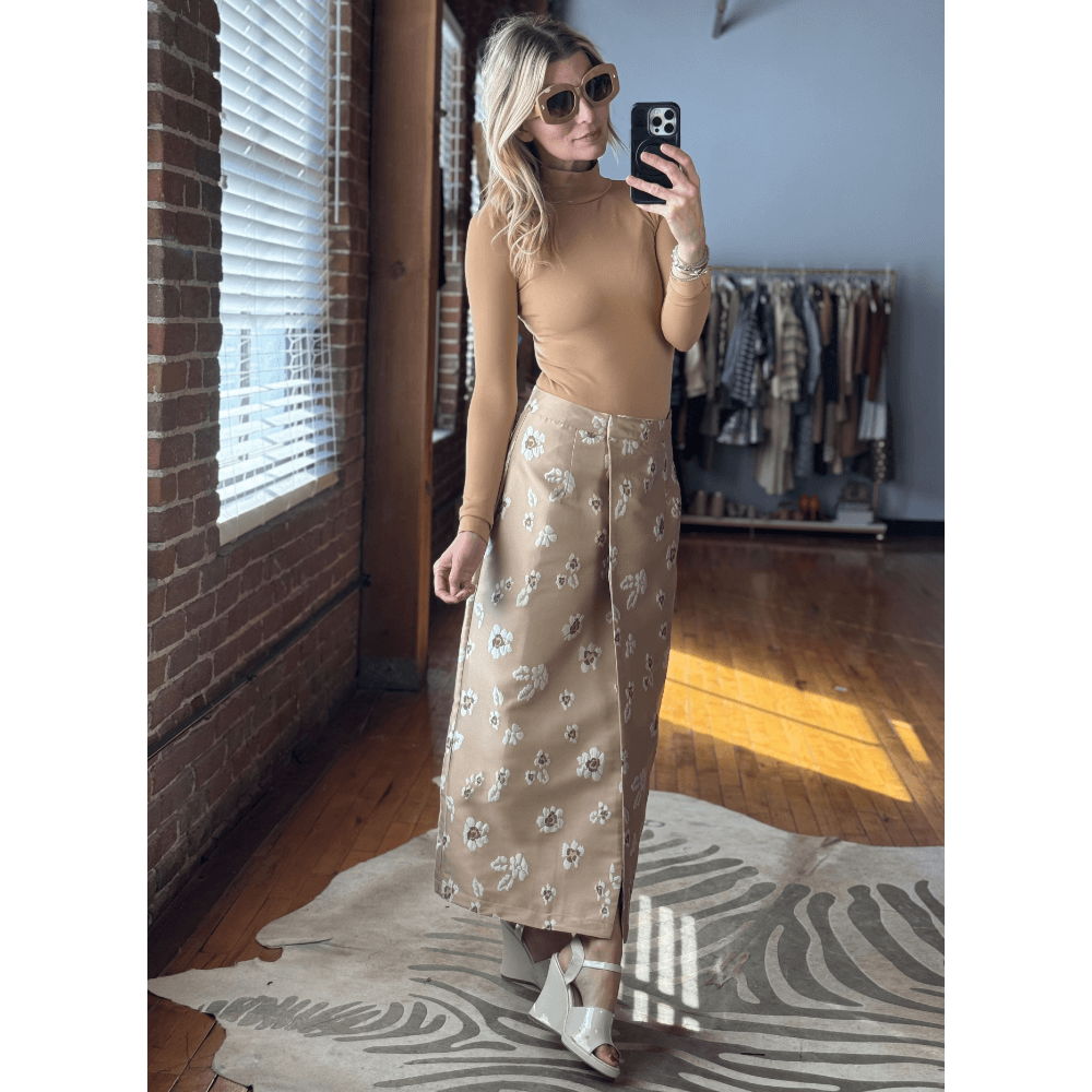 Our caramel Long Sleeve Turtleneck pairs perfectly with the Whitney Wrap Skirt pulling together the caramel hues in each piece. And the wear-with-anything ivory Peep Toe wedges are an easy match.