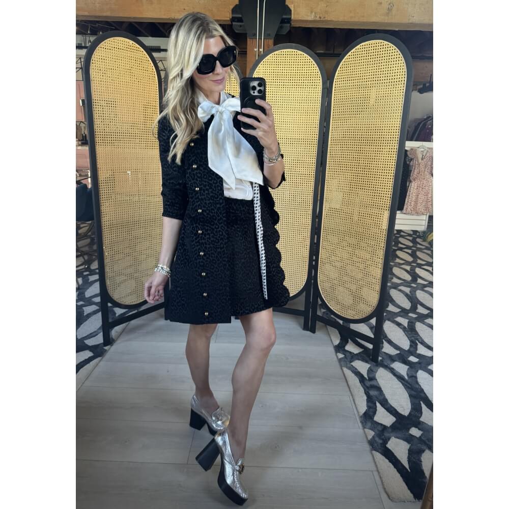 A picture of versatility...leave the Scallop Dress unbuttoned and treat it as a jacket. Pair with our Big Bow Blouse and Maggie Mini Skirt for a classic black and white ensemble.