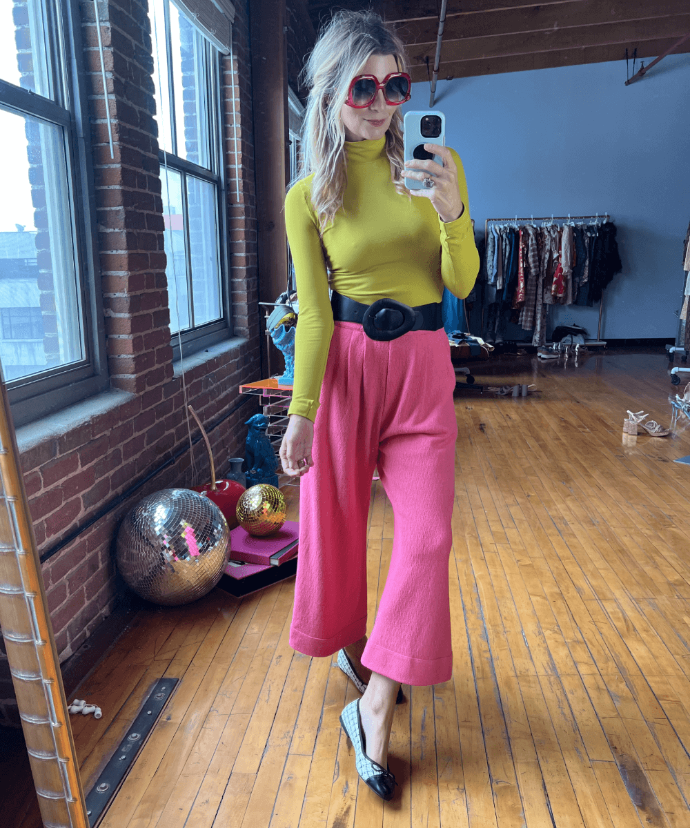Because pink and green is always a good idea! Pair her with our sweater knit Pink Pants and ballet flats for a comfy day at the office.