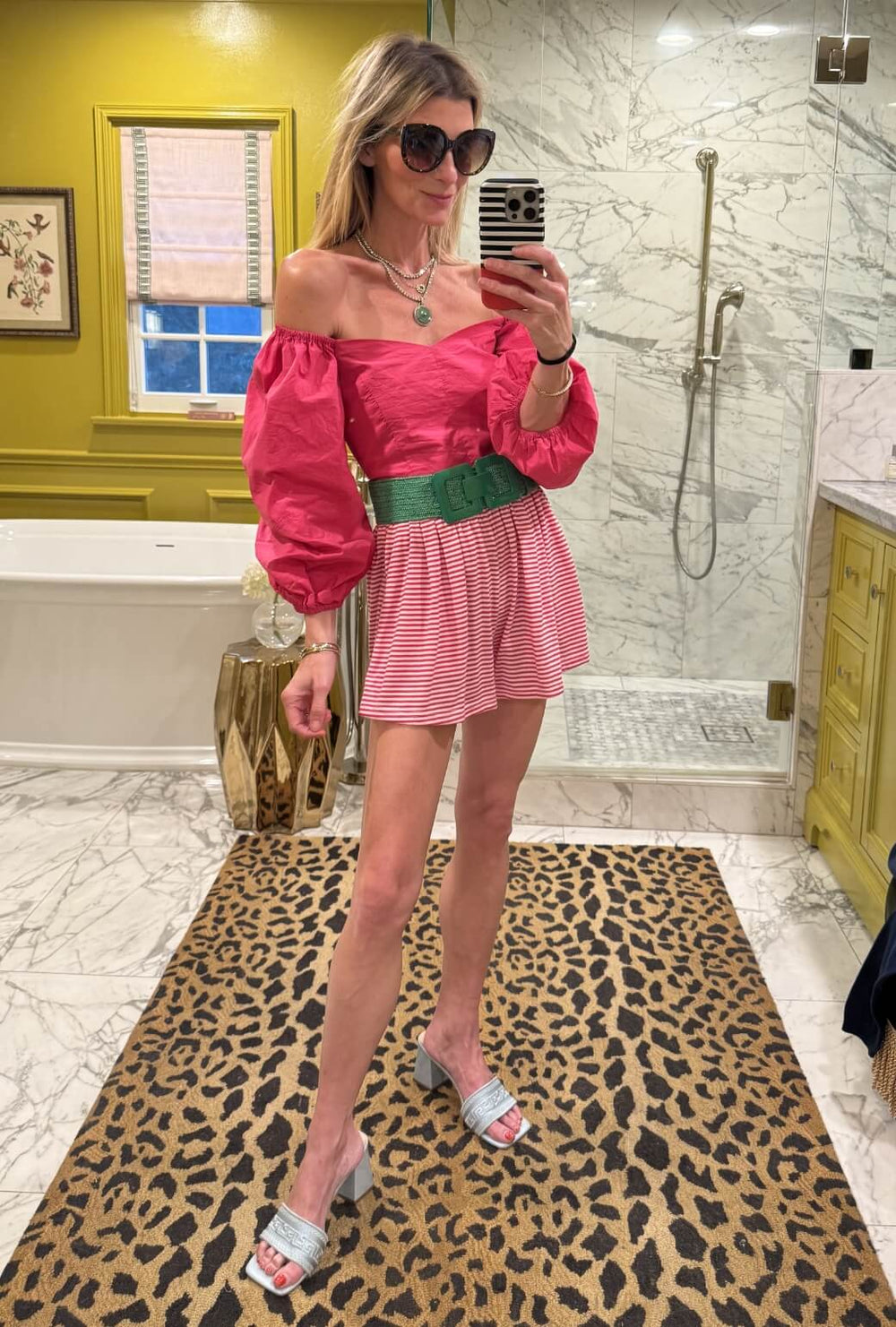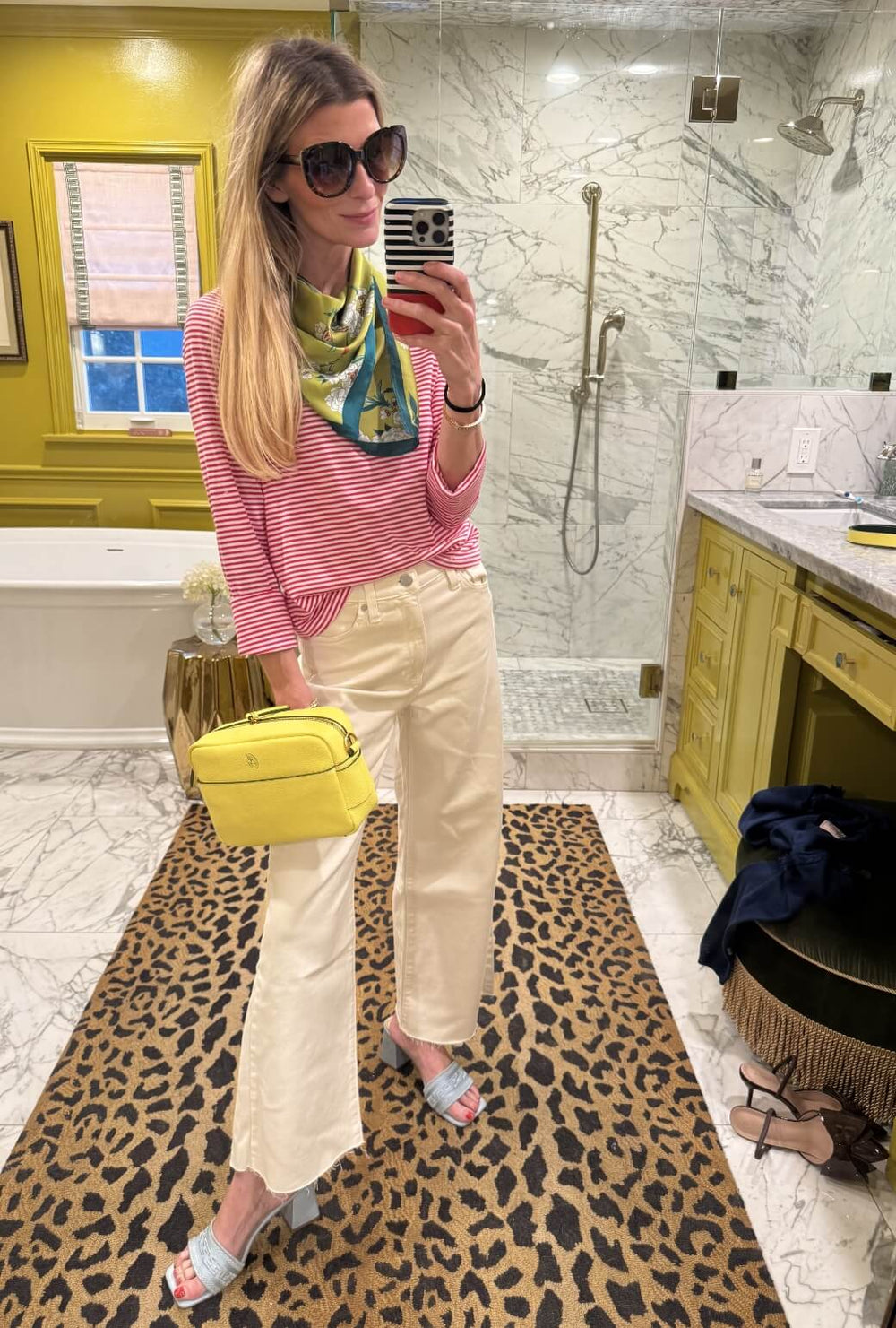 The pink and white crewneck tee is a no brainer match for ivory jeans. Add extra polish with our new Le Scarf, a block heel sandal and our standout Belmont Crossbody.